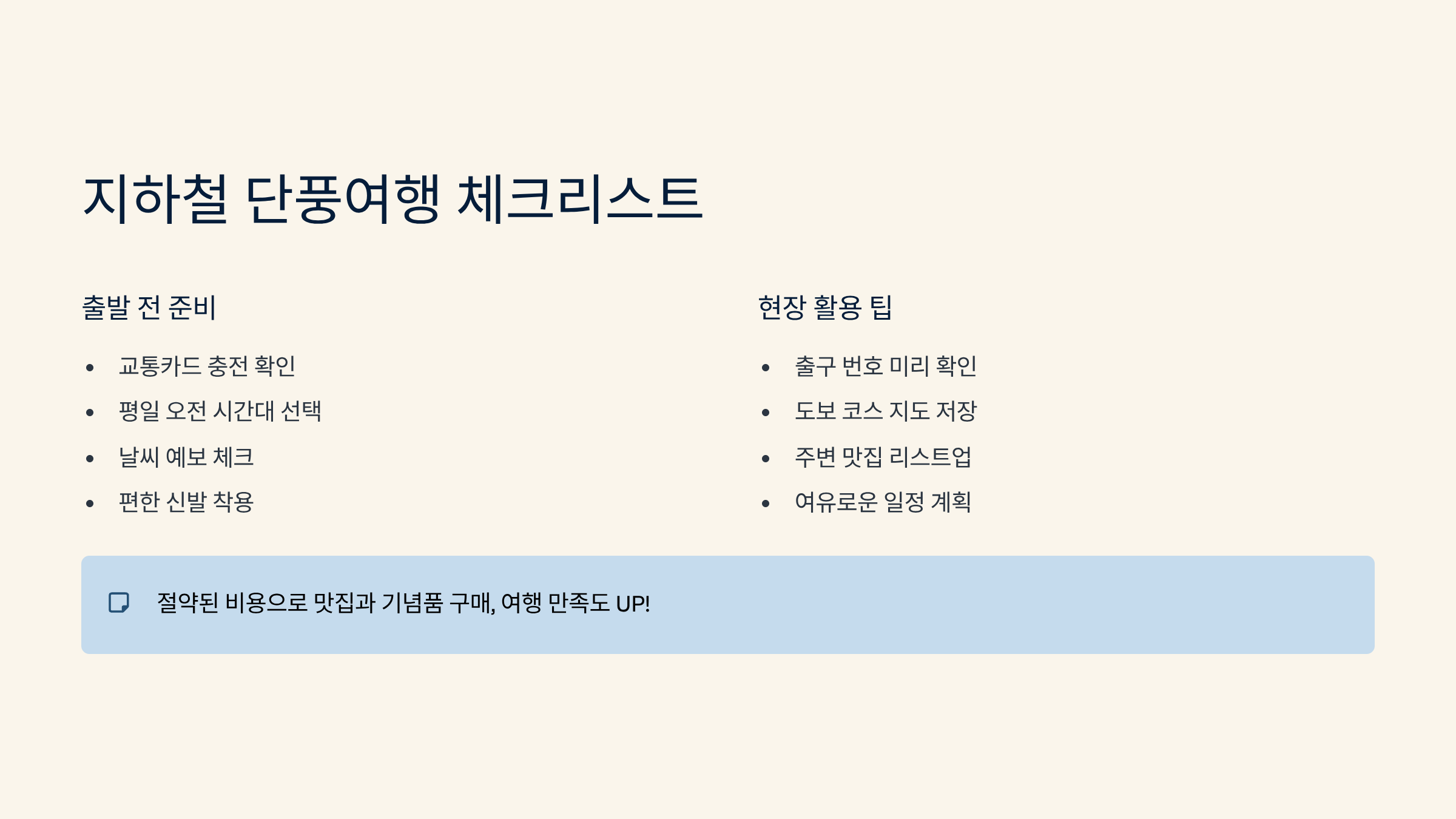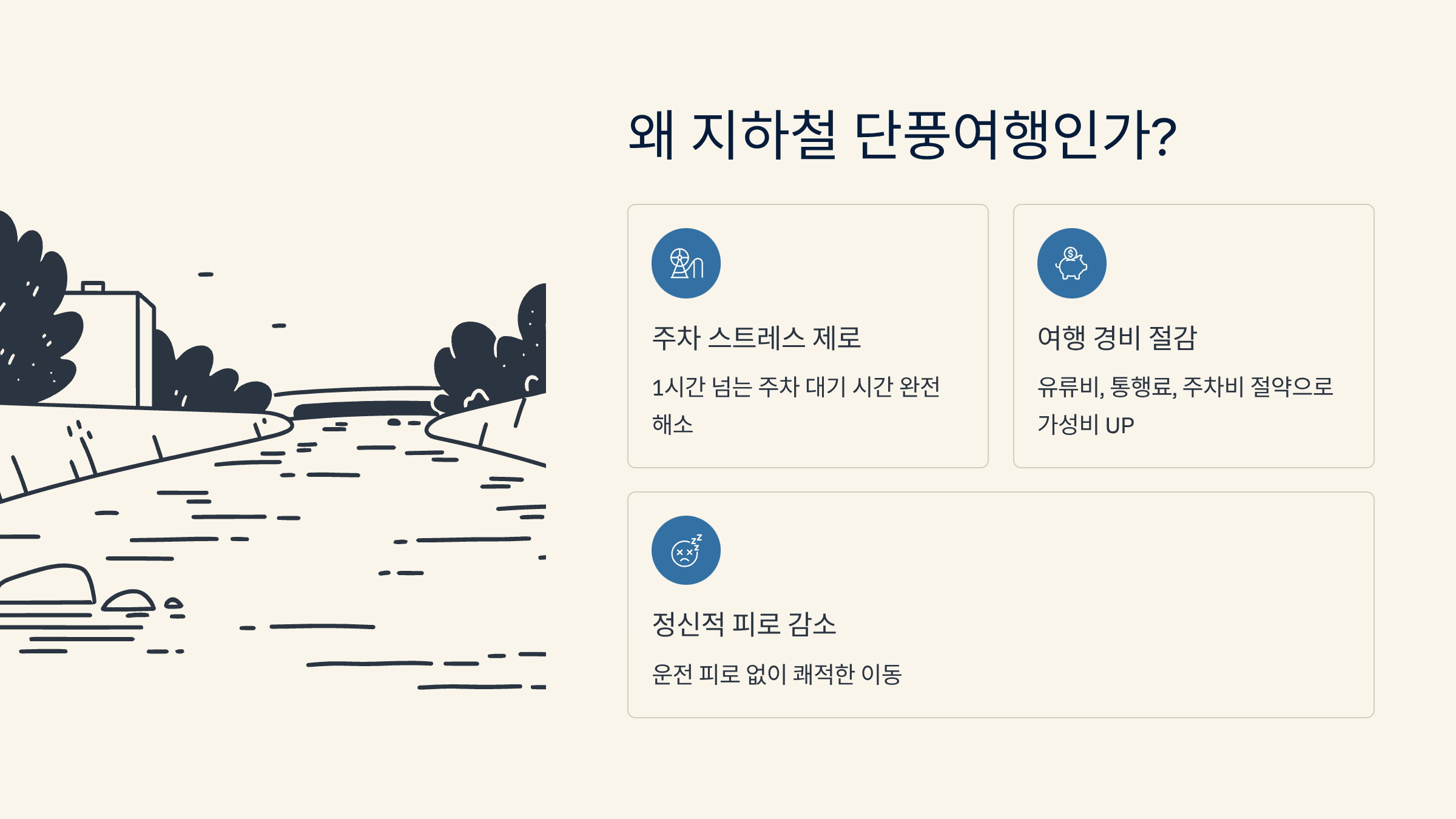 이 글은 복잡한 운전, 주차 스트레스, 비싼 기름값 등의 고민을 한 번에 해결해 줄 '지하철 타고 떠나는 초간편 가성비 가을 여행지'를 집중적으로 안내합니다.