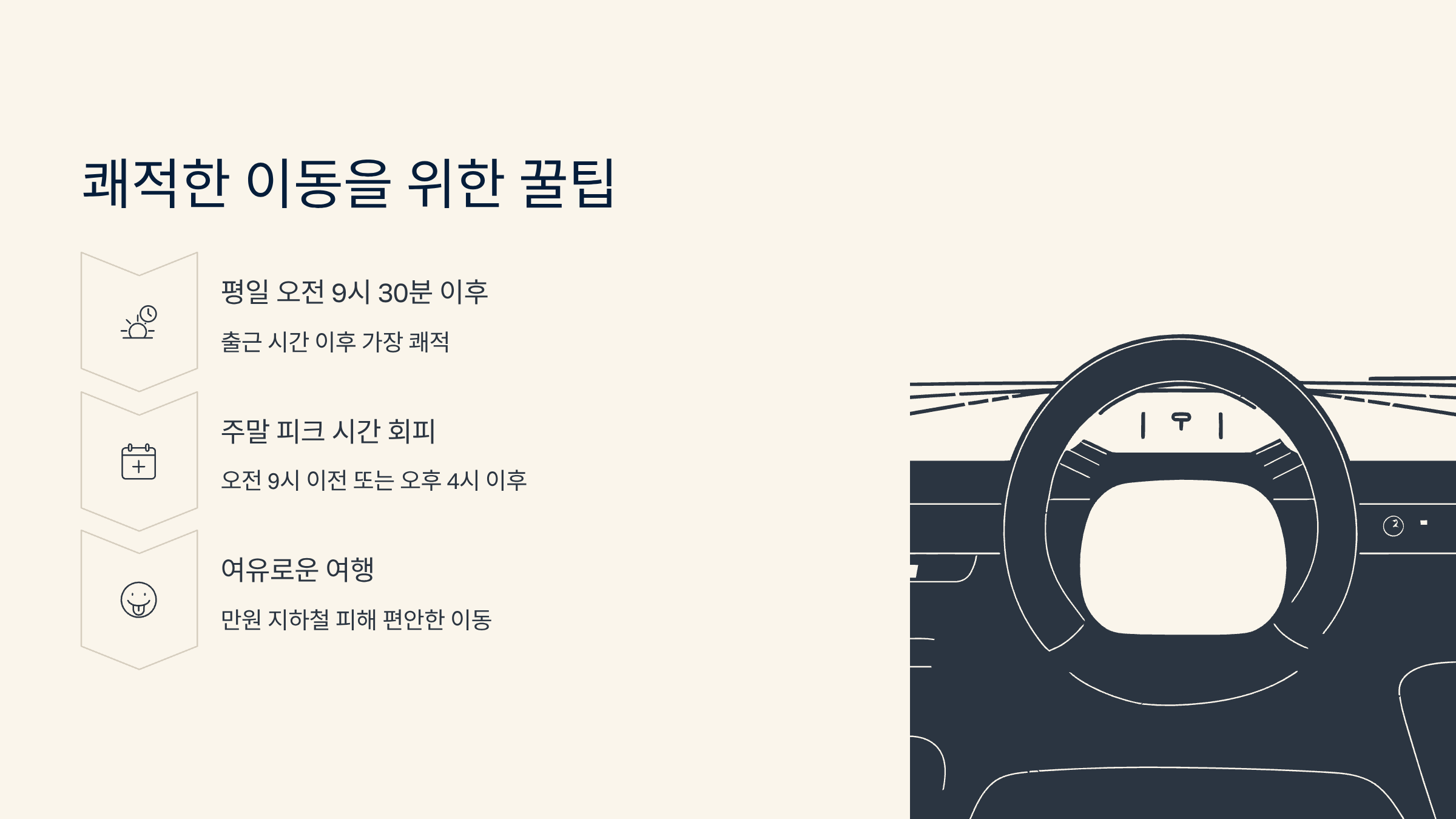 - 주말 피크 시간 회피: 주말이라면 오전 11시부터 오후 3시 사이는 피하고, 오전 9시 이전 또는 오후 4시 이후에 이동하는 것이 좋습니다.