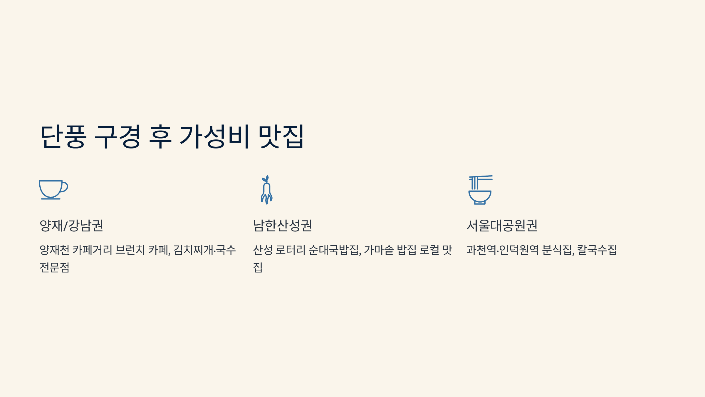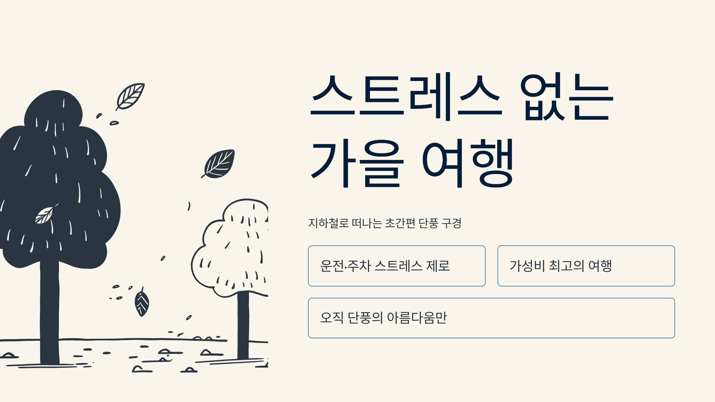 또한, 만원 지하철을 피하고 쾌적하게 이동할 수 있는 대중교통 이용 꿀팁과 단풍 구경 후 즐길 수 있는 가성비 맛집 정보까지 제공하여 스트레스 없는 가을 여행을 돕습니다.