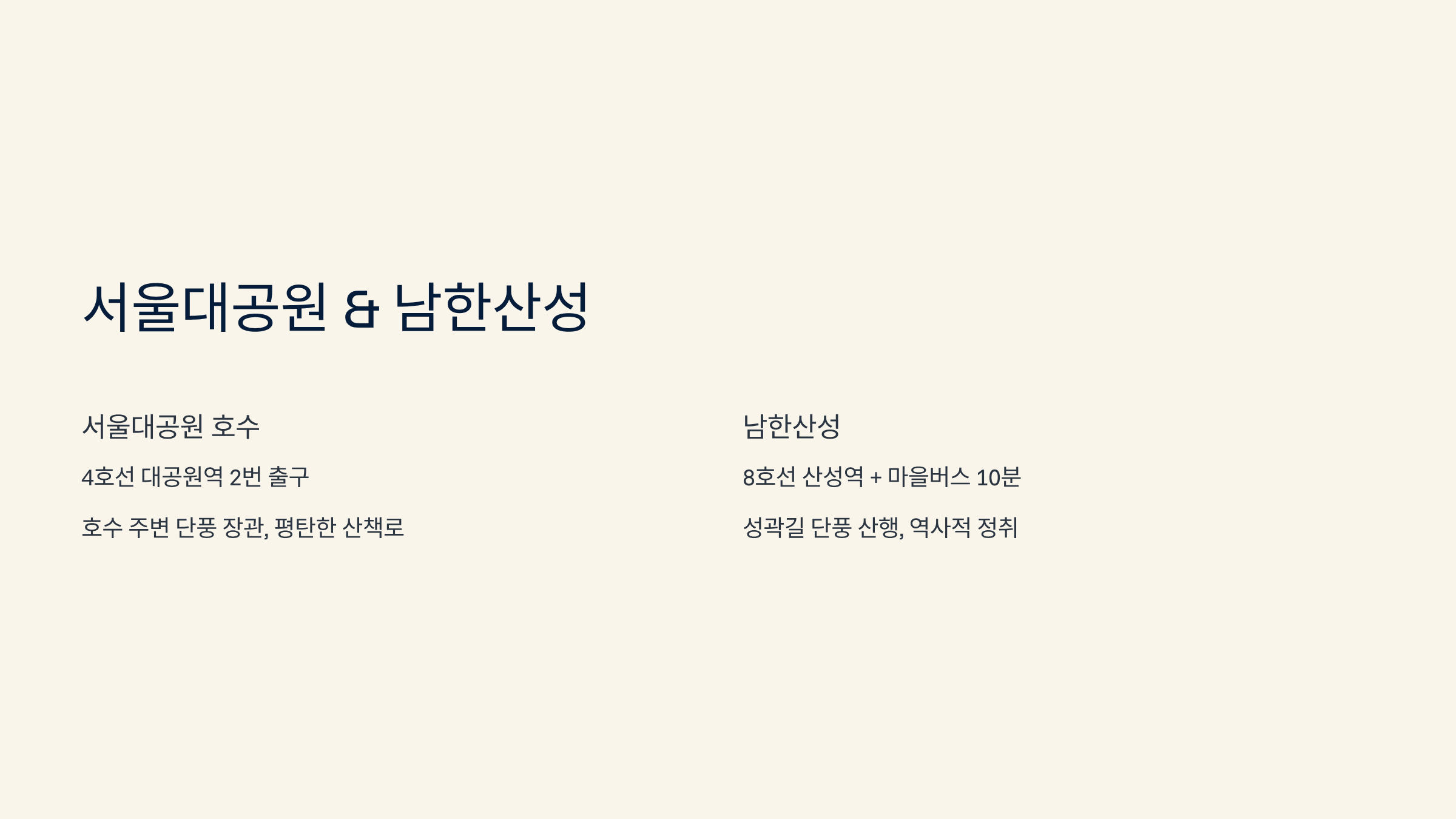- 대공원역 (서울대공원): 2번 출구로 나와 분수대를 지나 호수 주변 산책로를 따라 걷기 -> 미술관 주변 단풍 감상 (총 소요시간: 1시간 30분~2시간)