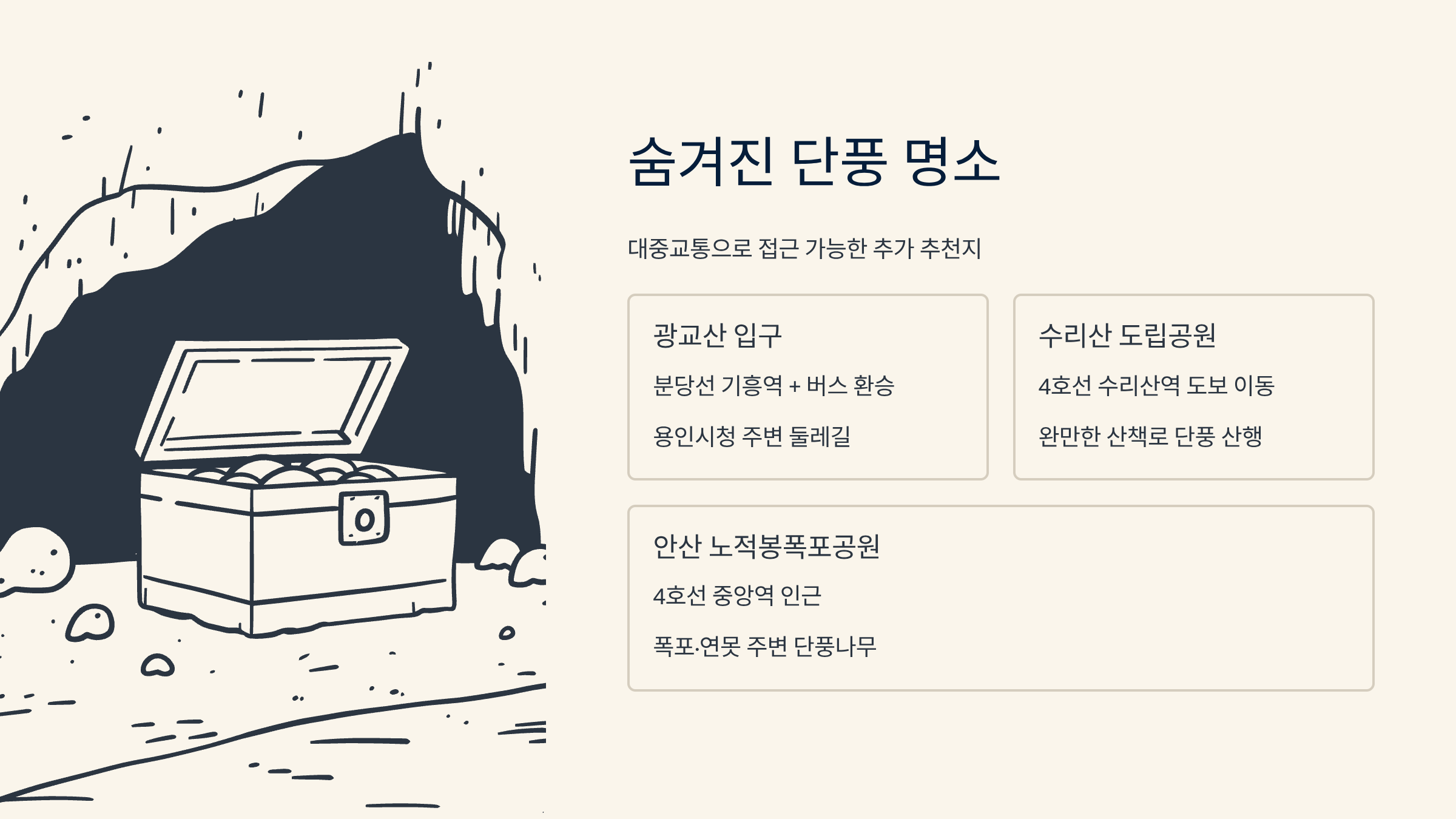 운전이 어렵거나 자가용이 없는 경우, 대중교통으로도 충분히 아름다운 단풍을 즐길 수 있는 숨겨진 명소들을 활용할 수 있습니다.