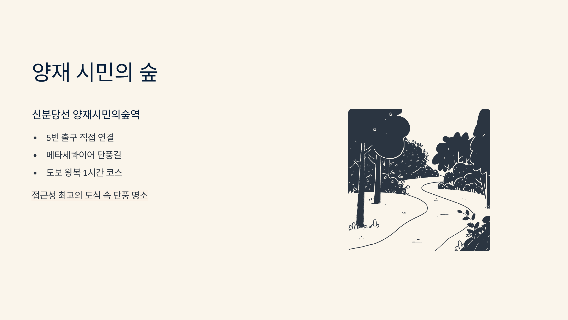 - 양재 시민의 숲 (신분당선 양재시민의숲역): 역 출구(5번 출구)와 공원이 바로 연결되어 있어 접근성 최고입니다. 단풍나무와 메타세콰이어 길이 아름답고, 도심 속에서 여유롭게 단풍을 즐길 수 있습니다.