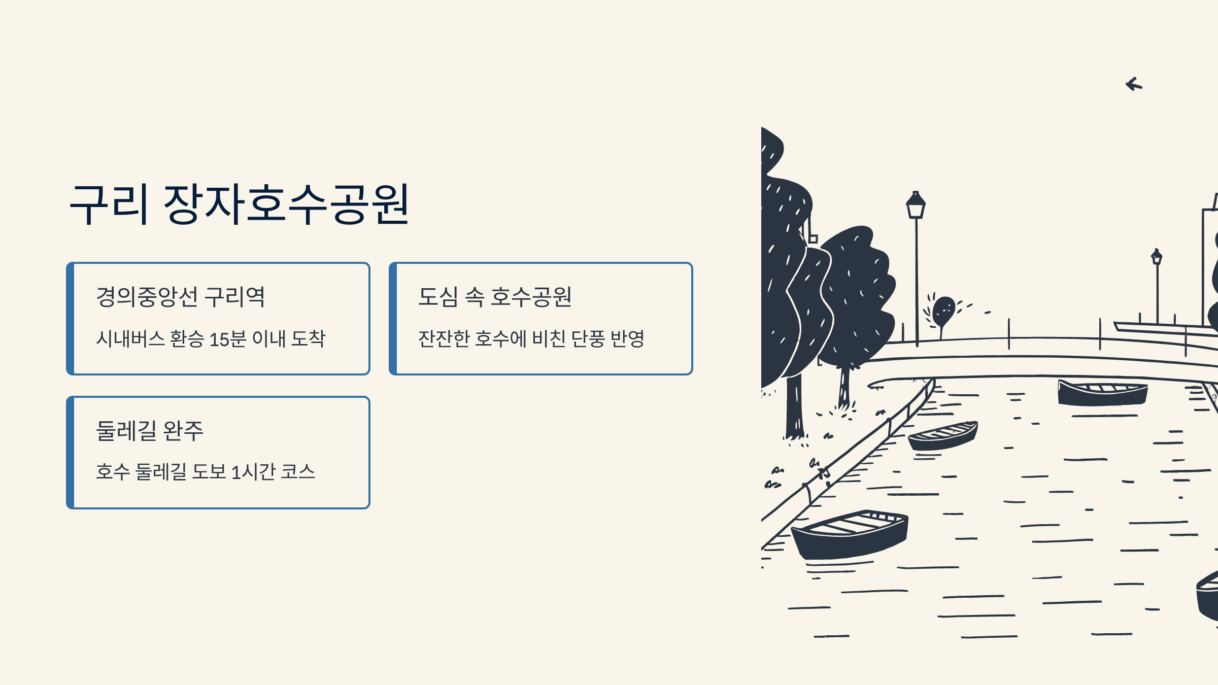 - 구리역 (장자호수공원): 3번 출구로 나와 마을버스 6번 탑승 -> 장자호수공원 정류장 하차 -> 호수 둘레길 완주 (총 소요시간: 버스 이동 15분, 둘레길 도보 1시간)
