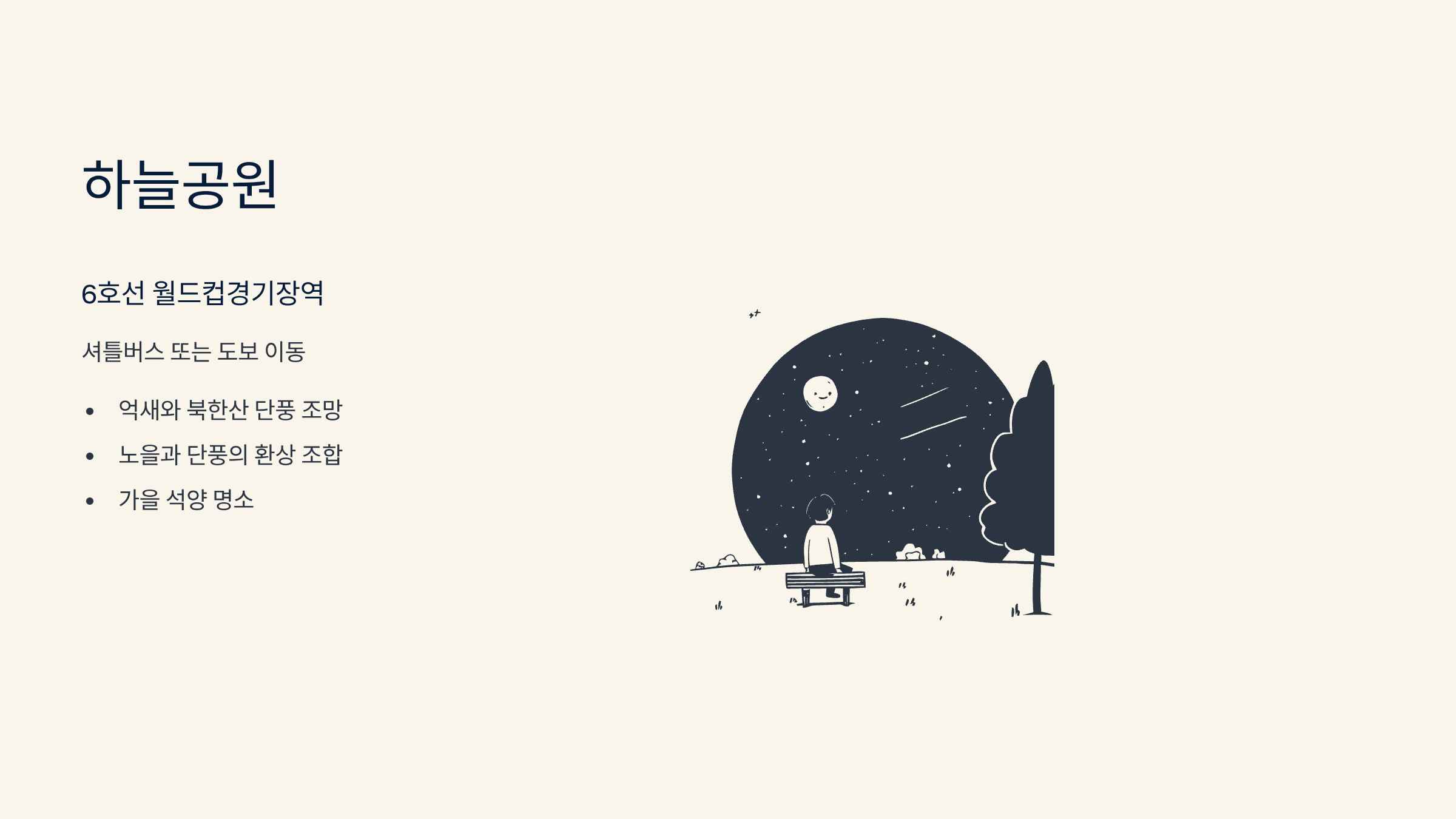 - 하늘공원 (6호선 월드컵경기장역): 역에서 내려 셔틀버스 또는 도보로 이동합니다. 억새와 함께 멀리 보이는 북한산 단풍을 조망할 수 있으며, 노을과 단풍이 어우러진 풍경이 특히 아름답습니다.