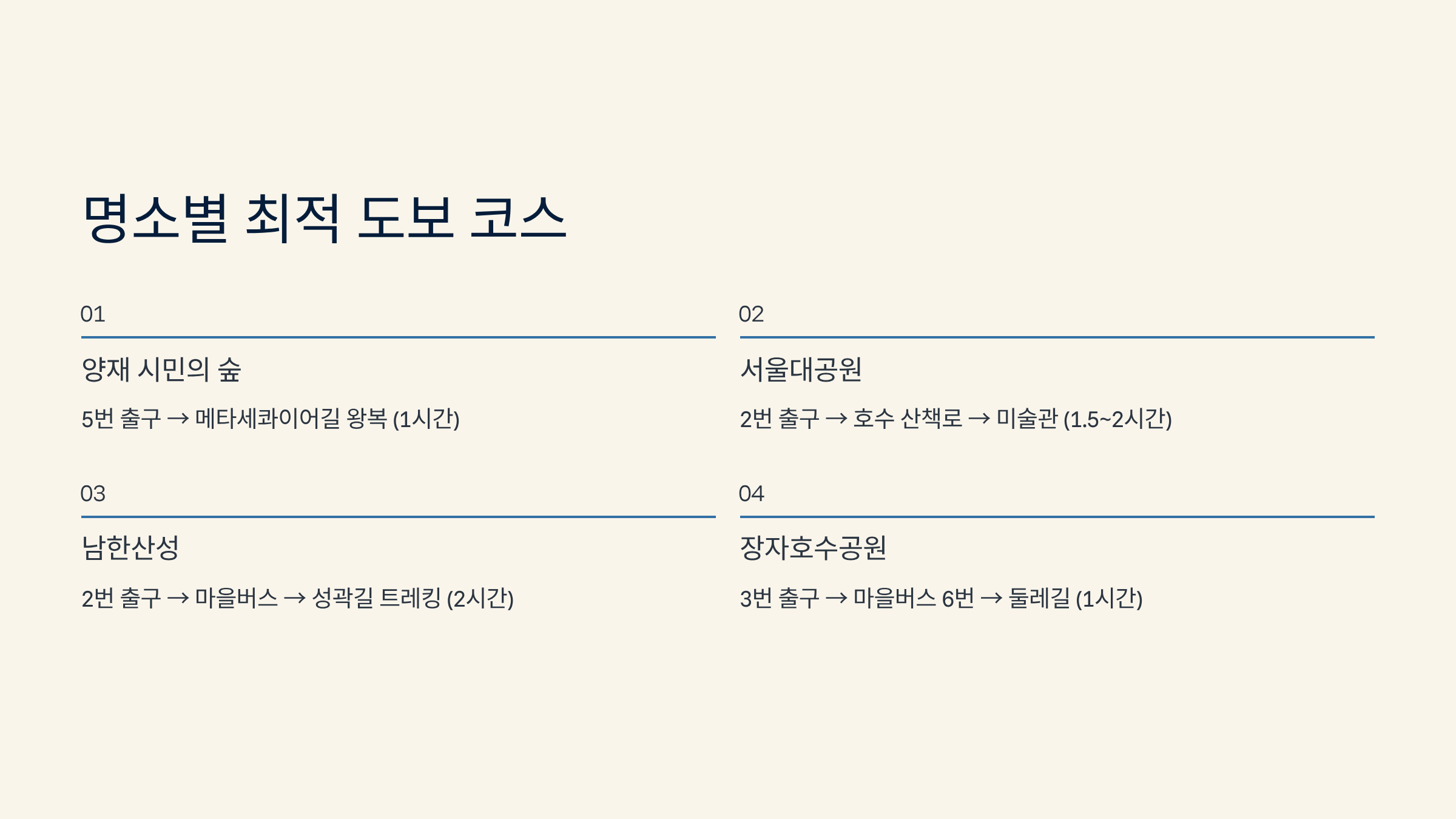 서울 근교 단풍명소를 즐기는 가장 현명하고 가성비 높은 방법은 바로 지하철을 이용하는 것입니다. 운전과 주차 스트레스 없이 지하철역에서 도보로 쉽게 접근 가능한 양재 시민의 숲, 서울대공원 등 5곳의 명소를 참고하여 당신의 가을 여행지를 확정하십시오. 만원 지하철을 피할 수 있는 평일 오전 시간대 이용 꿀팁과 명소 주변의 가성비 맛집 정보를 활용하여, 이번 가을에는 스트레스 없이 오직 단풍의 아름다움만을 만끽하는 초간편 가을 여행을 즐기시기를 바랍니다.