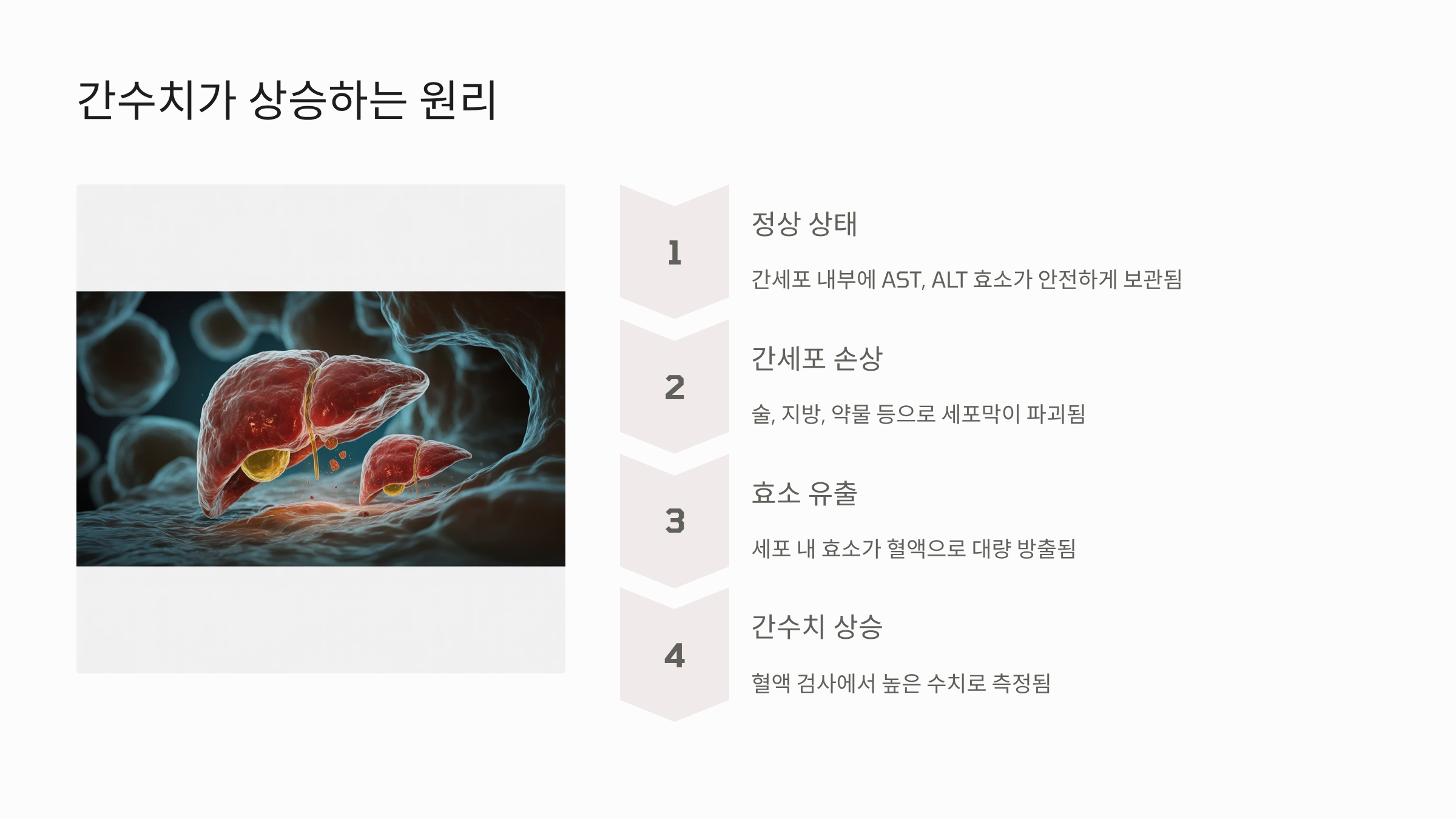 - 간수치 상승 원리: 간세포가 술, 지방, 약물 등 외부 요인에 의해 손상되거나 파괴되면, 세포 내부에 있던 AST와 ALT 효소가 혈액 속으로 다량 유출됩니다. 혈액 검사에서 이 효소들의 수치가 높게 측정되는 것이 곧 '간수치가 높다'고 진단되는 원리입니다.