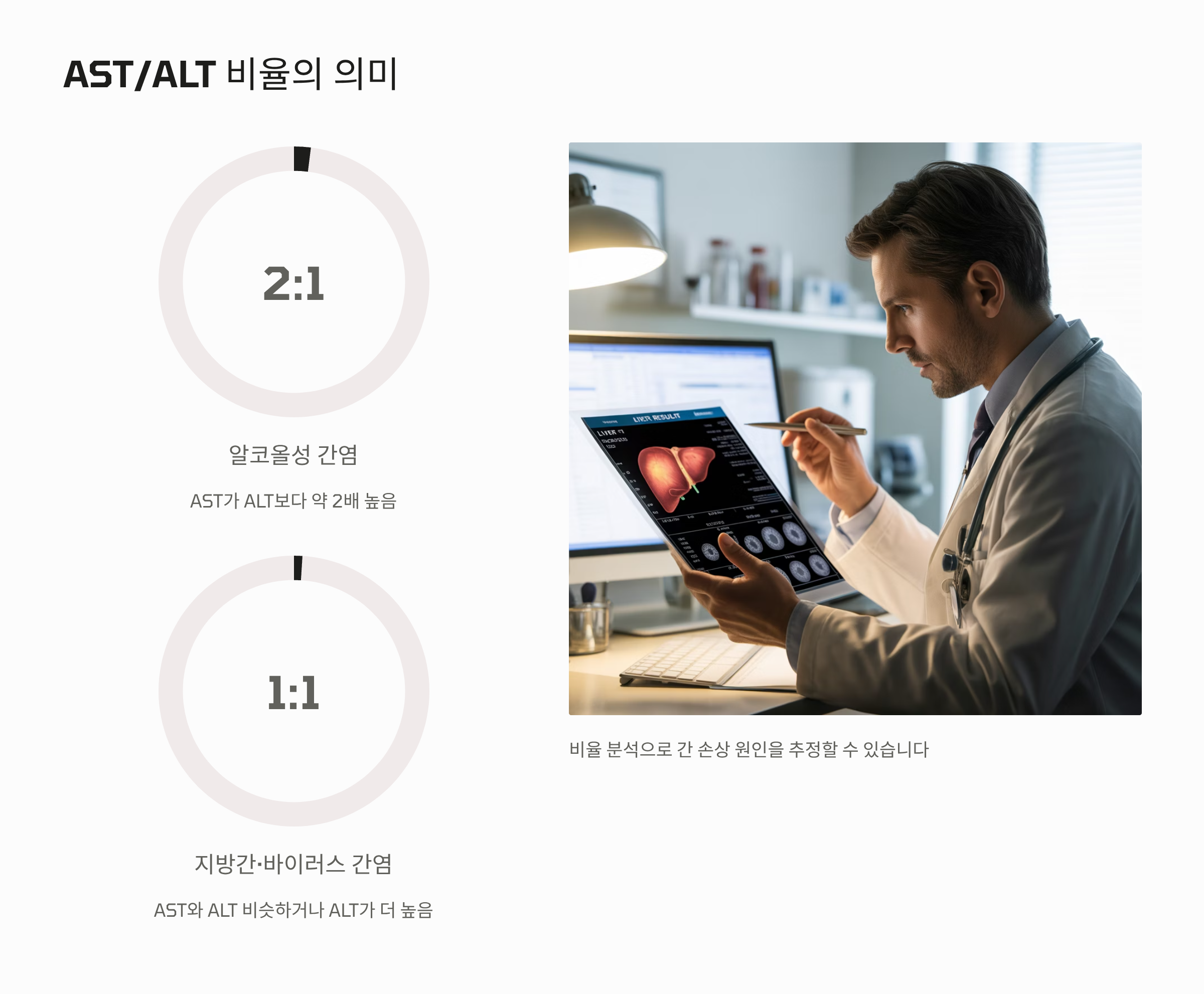 - AST/ALT 비율: 알코올성 간염의 경우 AST 수치가 ALT 수치보다 약 2배 이상 높게 나타나는 특징을 보이기도 합니다.