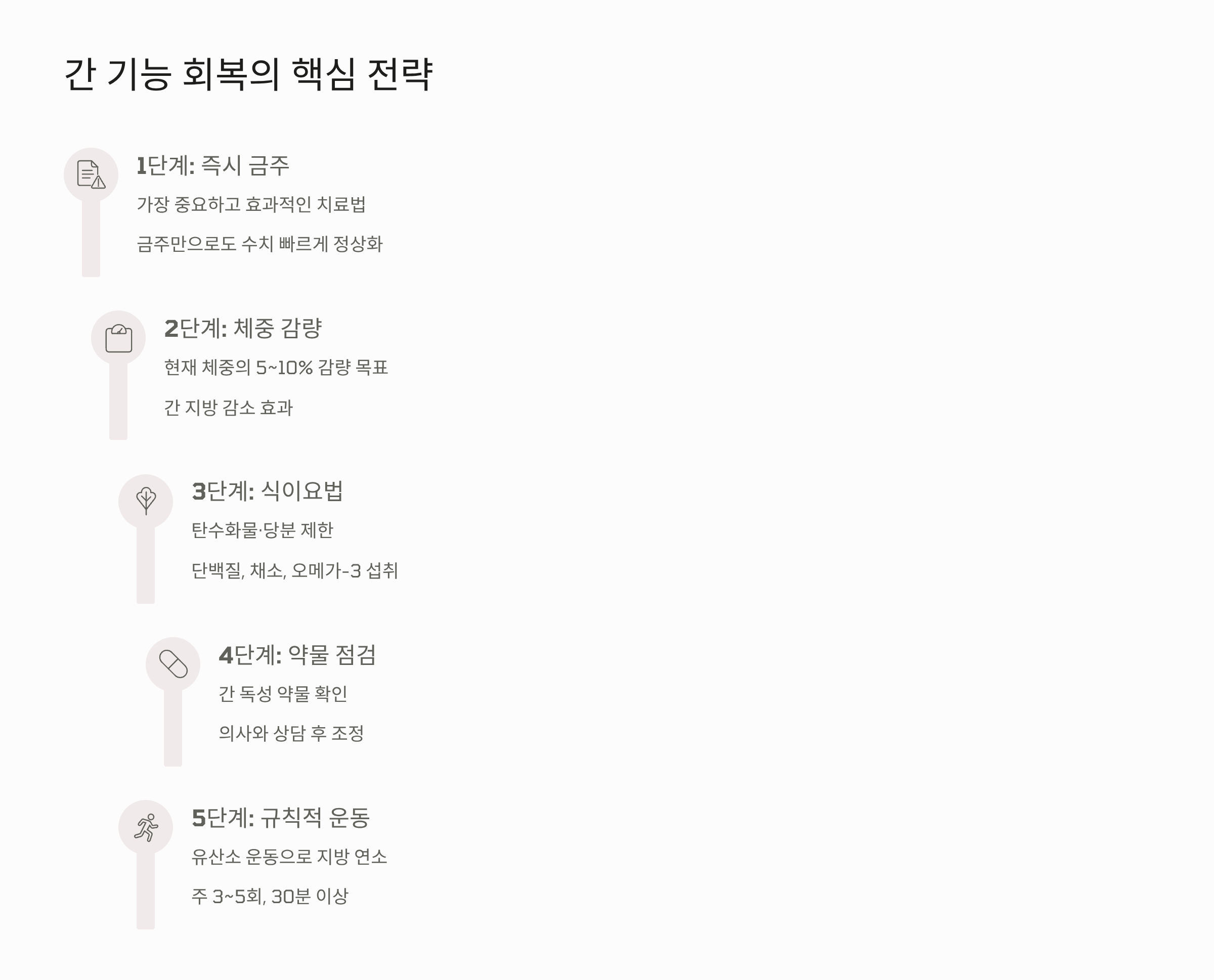 - 금주 (가장 우선): 알코올이 간수치가 높아지는 원인일 경우, 즉시 금주하는 것이 가장 중요하고 효과적인 치료법입니다. 금주만으로도 간수치가 빠르게 정상화되는 경우가 많습니다.