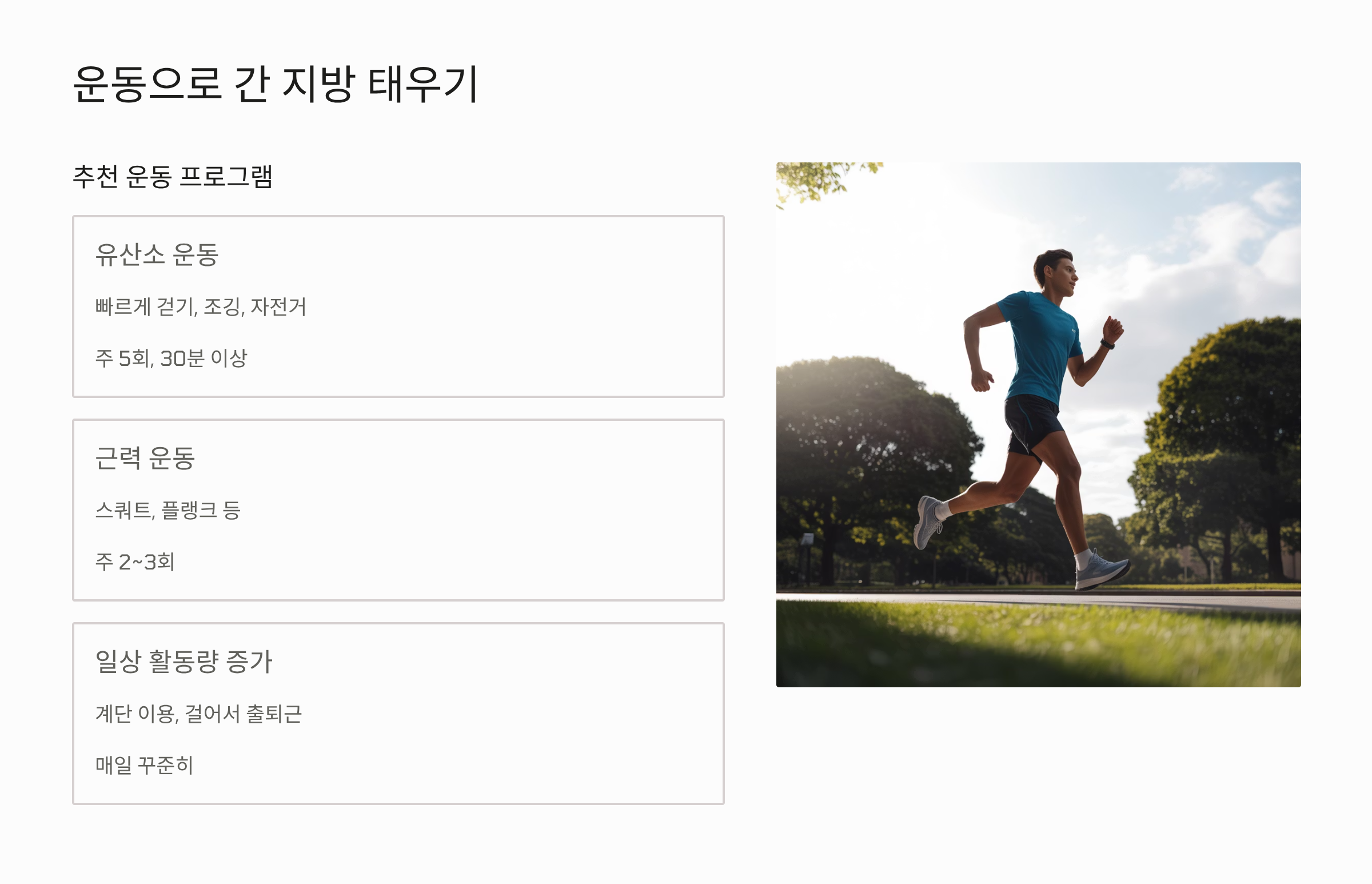 - 규칙적인 운동: 유산소 운동을 꾸준히 하여 체지방을 줄이고, 간에 쌓인 지방을 연소시키는 데 도움을 주어야 간수치를 낮출 수 있습니다.