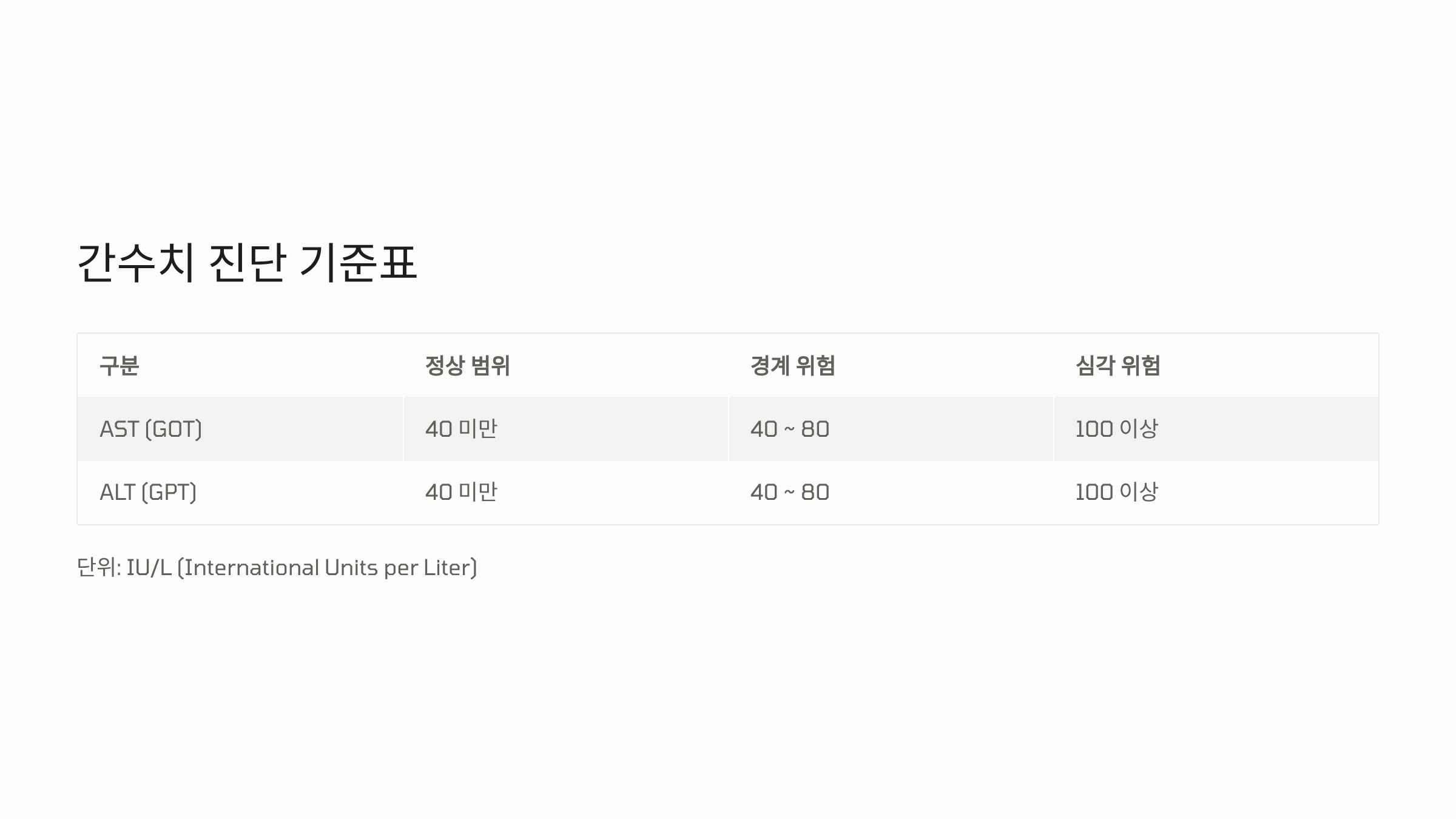 - 정상 범위: AST, ALT 수치가 40 IU/L 미만일 경우 정상으로 판단합니다.