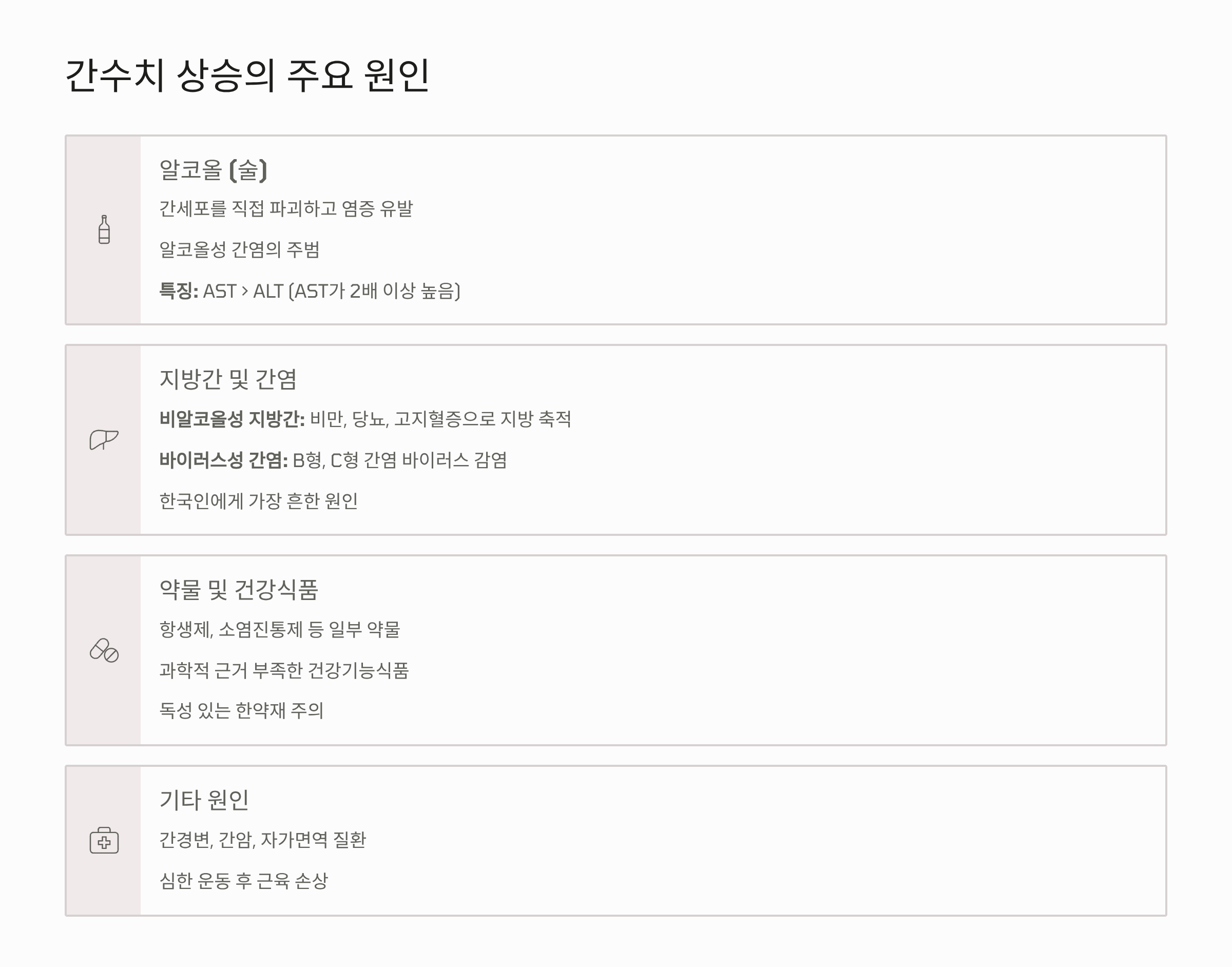 간수치가 높아지는 원인은 간세포 손상에 있으며, 이는 간염, 지방간, 약물 독성 등 다양한 요인으로 발생합니다.