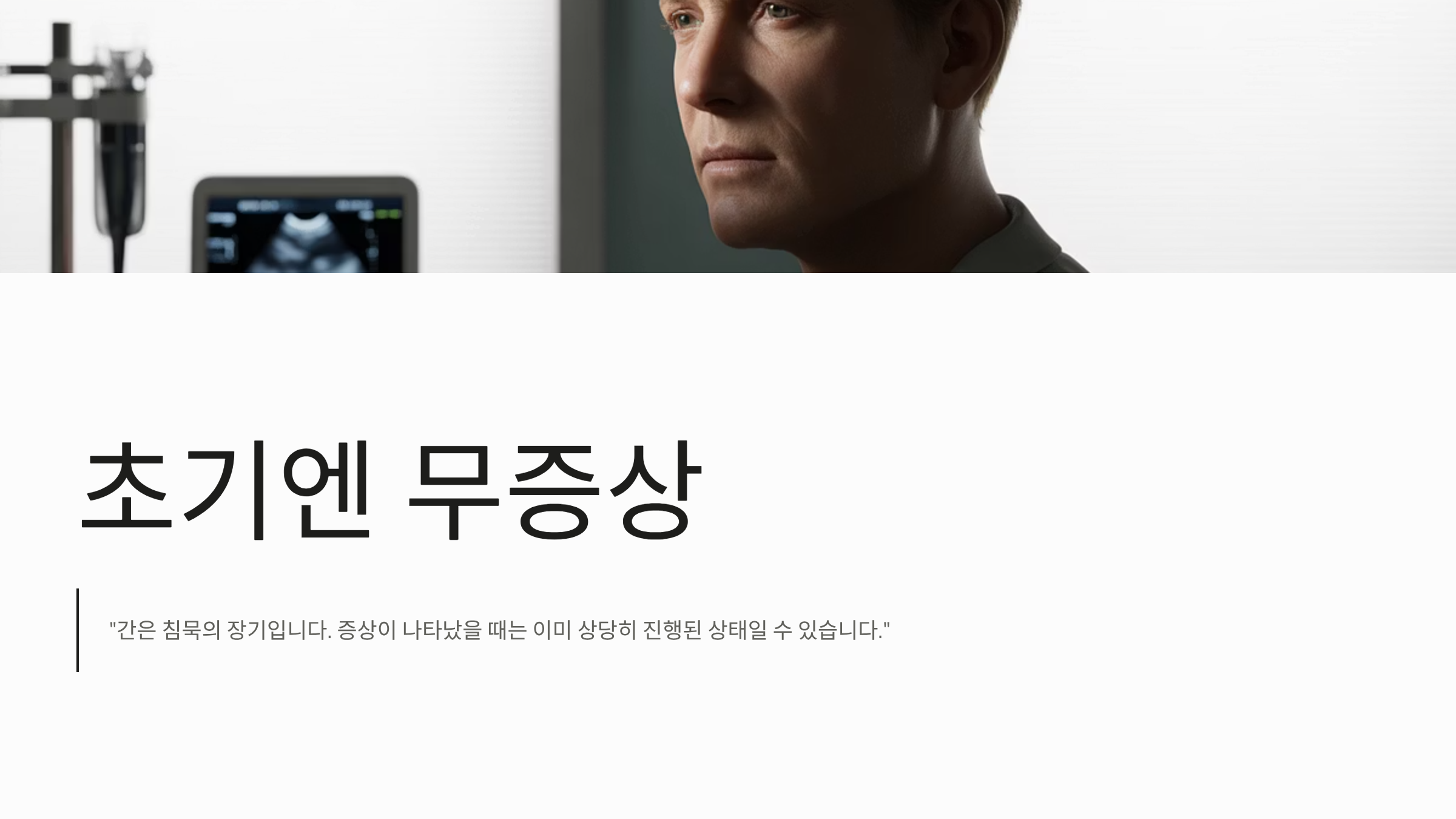 간은 '침묵의 장기'이므로 간수치가 높아지는 초기에는 무증상인 경우가 많습니다. 하지만 질환이 진행되면 다음과 같은 증상이 나타납니다.