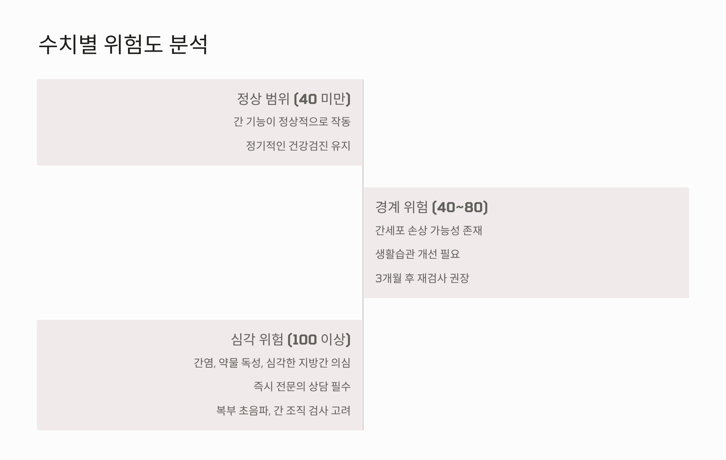 | 구분 | 정상 범위 (IU/L) | 경계 위험 (IU/L) | 심각 위험 (IU/L) |