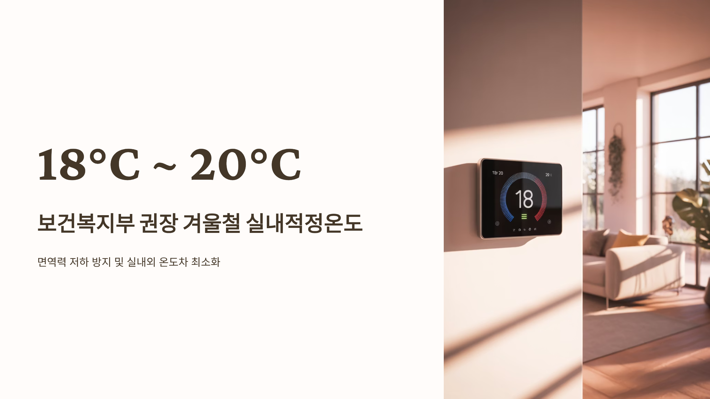 - 보건복지부 권장 기준: 우리나라 보건복지부와 에너지관리공단이 권장하는 겨울철 실내적정온도는 18°C ~ 20°C입니다. 이 온도 범위는 면역력 저하를 막고, 실내외 온도 차로 인한 감기 및 혈압 변동을 줄이는 데 가장 적합합니다.