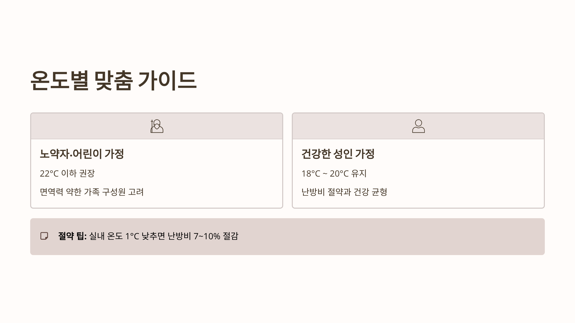 - 개인차 고려: 노약자나 면역력이 약한 어린이가 있는 가정은 22°C를 넘지 않는 선에서 온도를 설정하는 것이 좋으며, 건강한 성인 위주의 가정은 18°C~20°C를 기준으로 유지하는 것이 좋습니다.