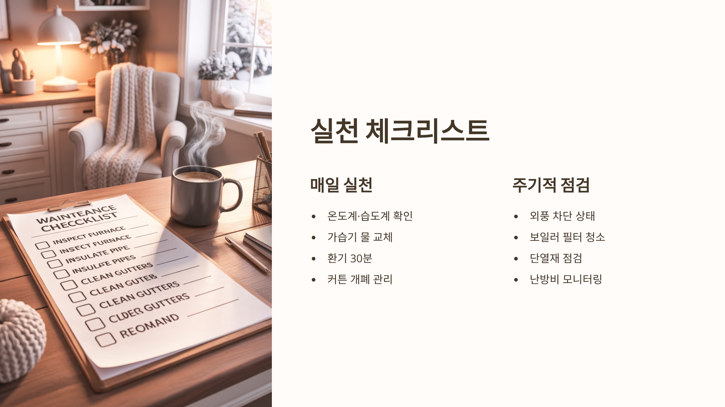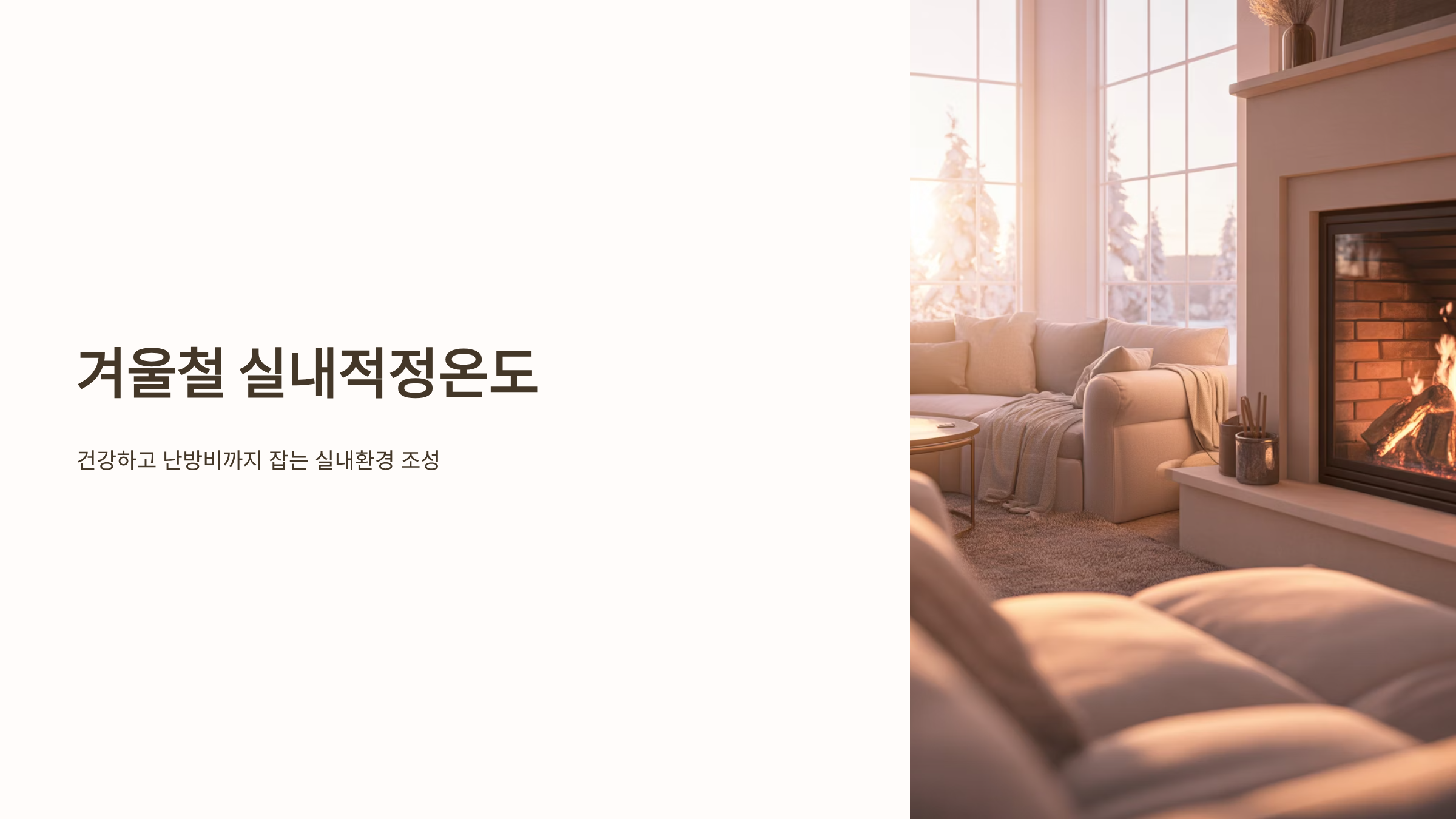겨울철 실내적정온도는 단순한 편안함을 넘어, 건강과 난방비 절약에 결정적인 영향을 미칩니다. 이 글은 난방 효율을 높이면서도 감기, 호흡기 질환을 예방할 수 있는 겨울철 실내적정온도 기준(보건복지부 권장 기준 포함)을 제시합니다. 온도와 함께 호흡기 건강을 위한 최적의 습도 유지 노하우를 안내합니다. 실내적정온도를 유지하며 난방비를 절약하는 구체적인 팁과 숙면을 위한 침실 온도 관리 전략까지 포함하여, 건강하고 쾌적한 실내 환경을 조성하는 실질적인 정보를 제공합니다.