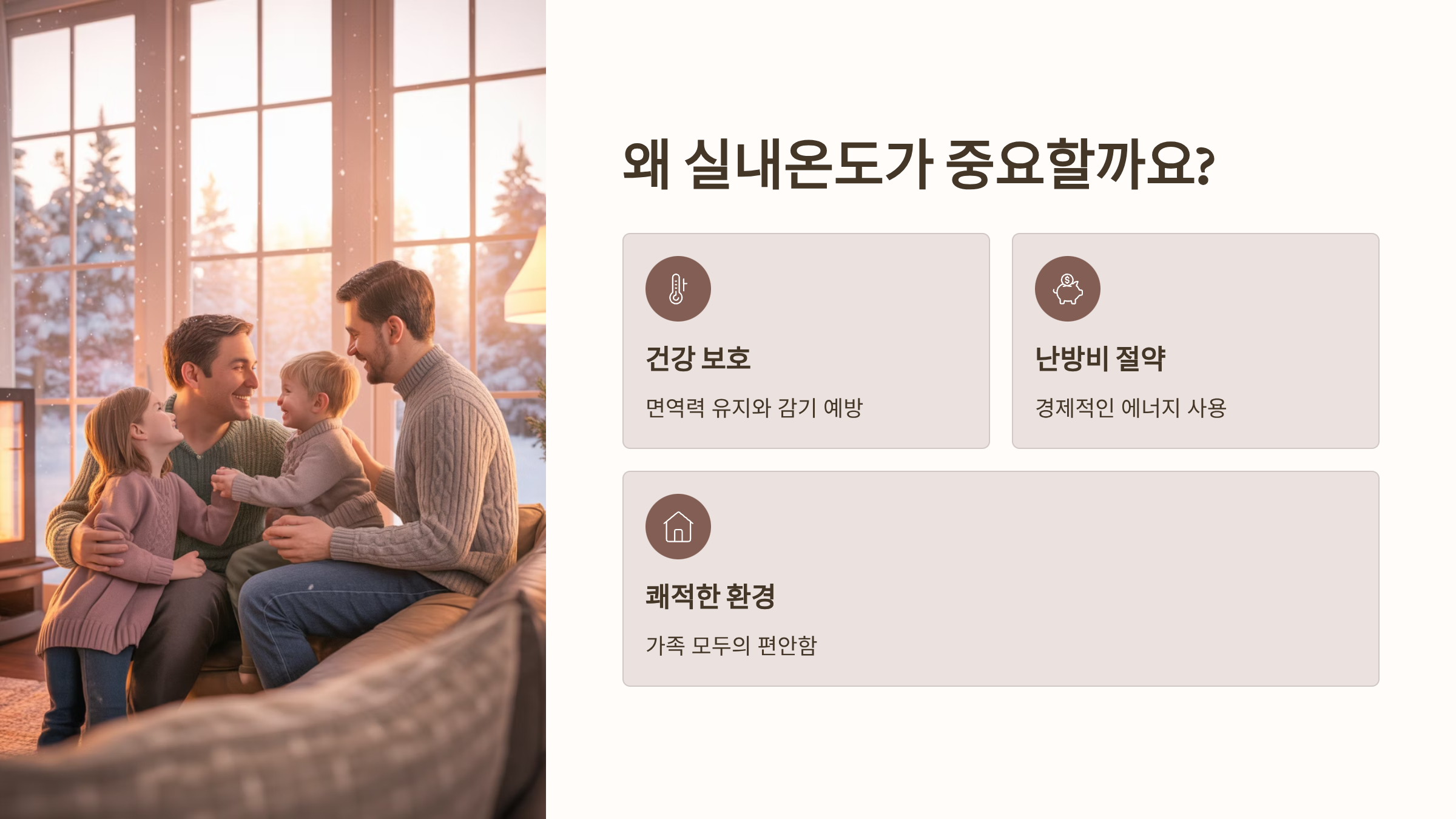 실내적정온도 유지는 단순한 편안함을 넘어, 신체의 면역 체계와 생활 활력에 직접적인 긍정적 영향을 미칩니다.