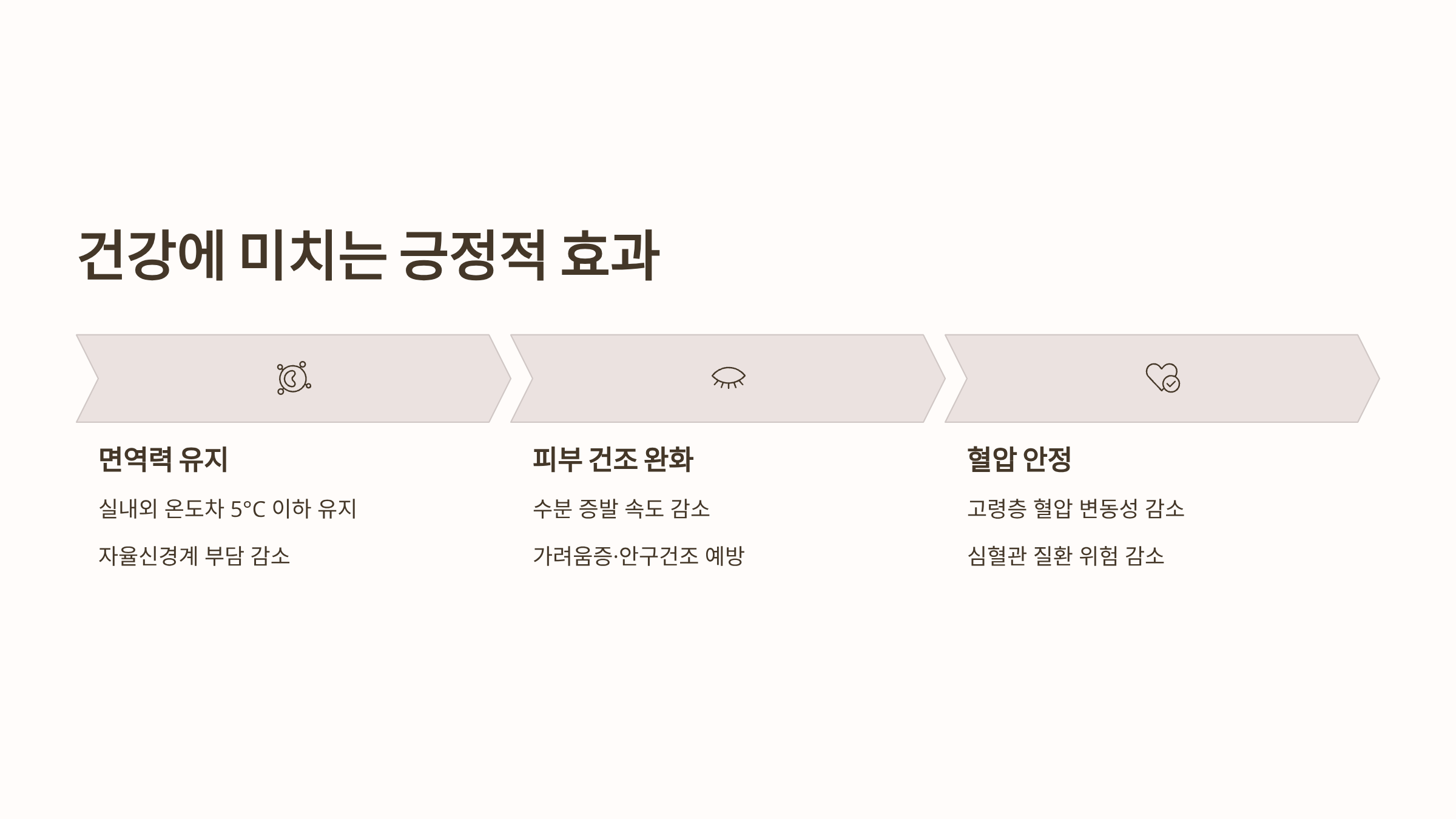 - 피부 및 안구 건조 완화: 과도한 난방은 피부 수분을 빼앗아 건조증, 가려움증, 안구 건조증을 유발합니다. 실내적정온도와 적정 습도를 유지하면 신체의 수분 증발 속도를 늦춰 이와 같은 증상들을 완화할 수 있습니다.