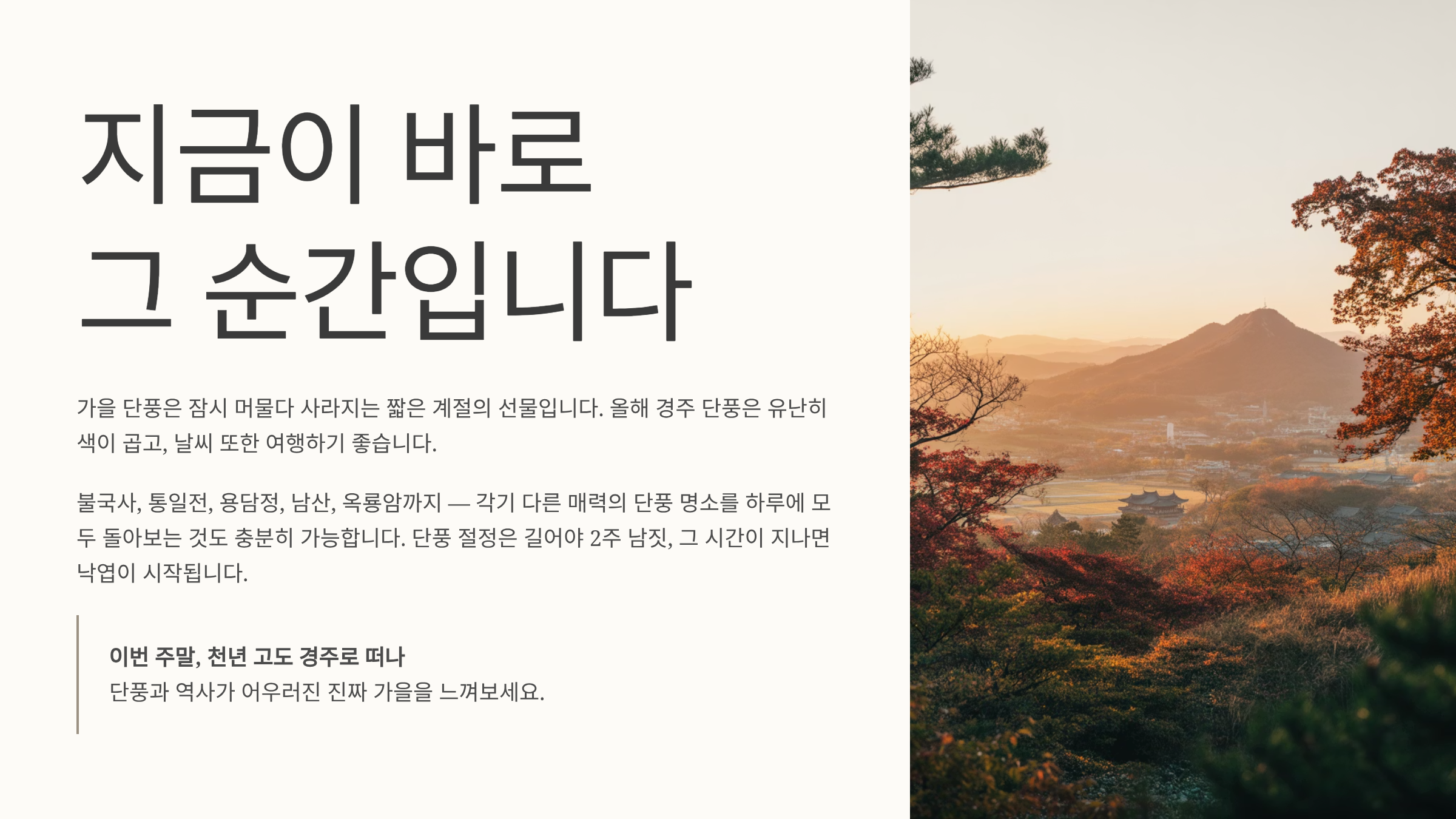지금이 바로 그 절정의 순간입니다. 이번 주말, 천년 고도 경주로 떠나 단풍과 역사가 어우러진 진짜 가을을 느껴보세요.