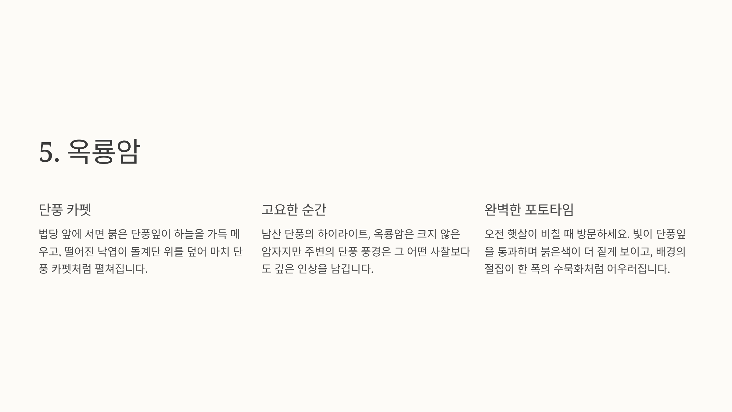 남산의 대표 포인트는 옥룡암입니다. 남산의 산자락에 자리한 작은 암자로, 단풍철이면 법당 주변과 계곡 길이 붉은빛으로 가득 물듭니다.