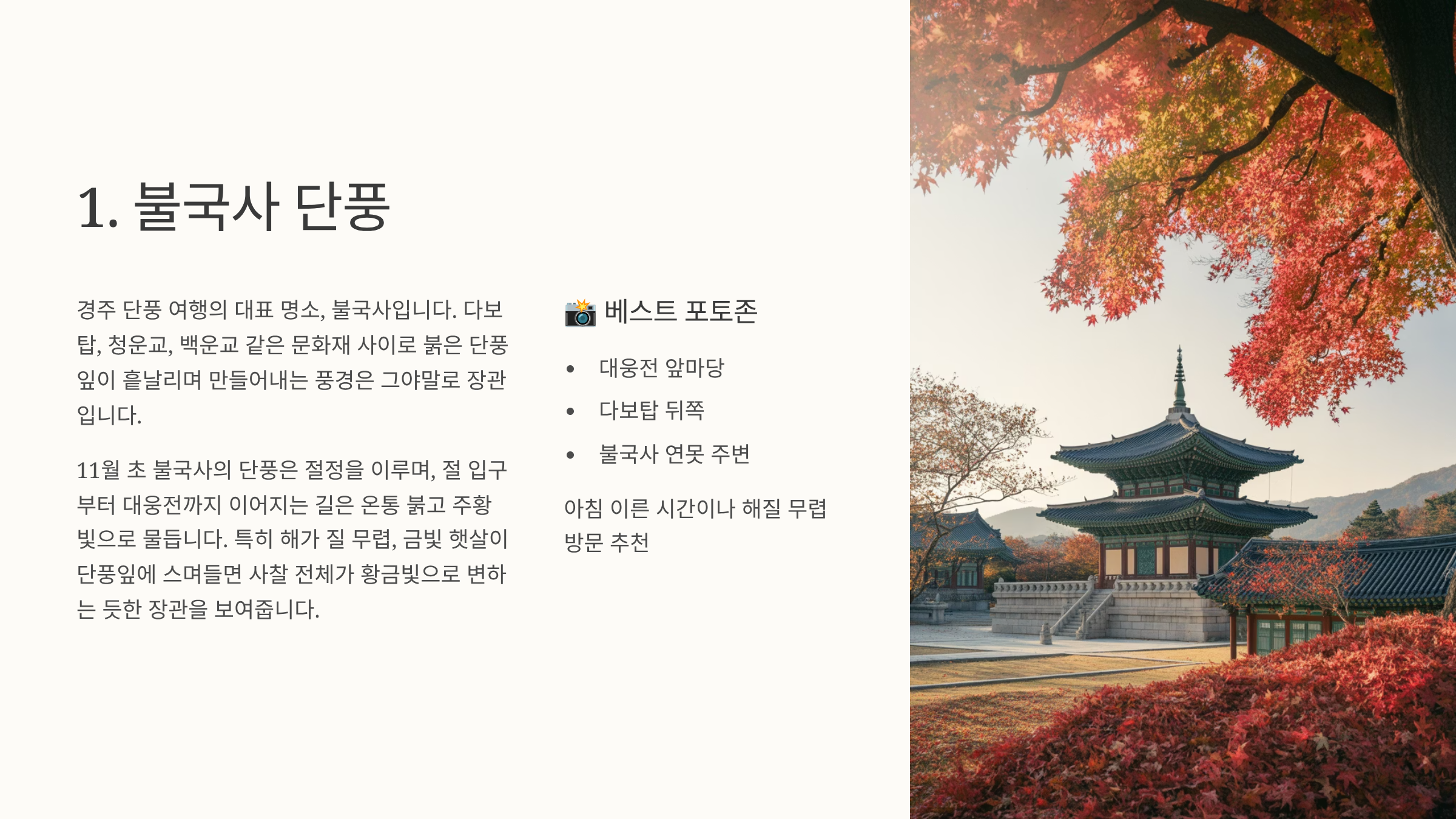 불국사, 통일전, 용담정, 남산, 옥룡암까지 — 각기 다른 매력의 단풍 명소를 하루에 모두 돌아보는 것도 충분히 가능합니다. 단풍 절정은 길어야 2주 남짓, 그 시간이 지나면 낙엽이 시작됩니다.