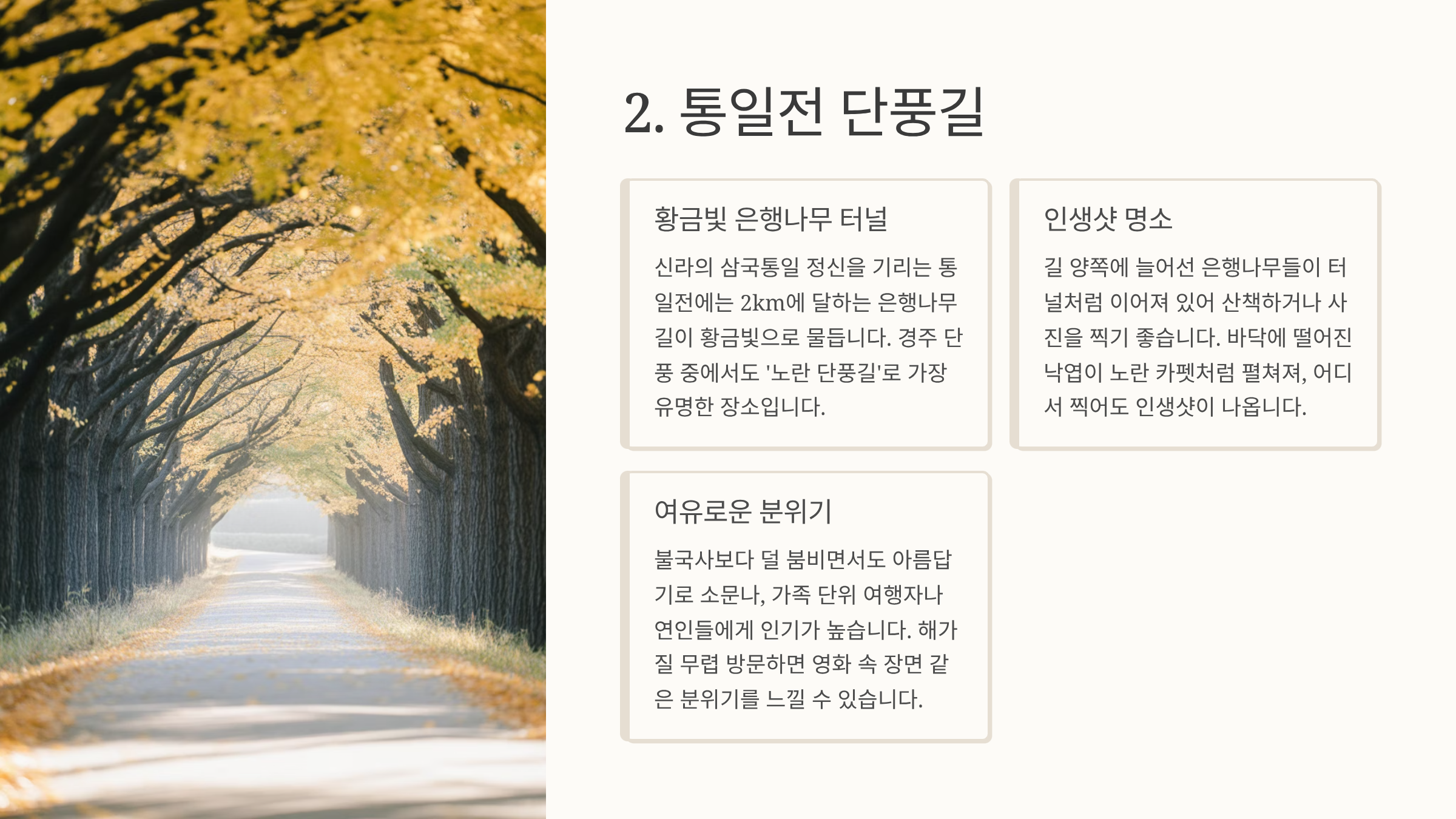 특히 경주는 한 도시 안에 사찰, 숲길, 유적지, 호수, 그리고 감성 거리인 황리단길까지 함께 있어 당일치기 여행이나 1박 2일 여행으로도 완벽합니다. 단풍과 유적, 그리고 맛있는 음식이 함께 있는 도시, 바로 지금 떠나야 하는 이유가 여기에 있습니다.