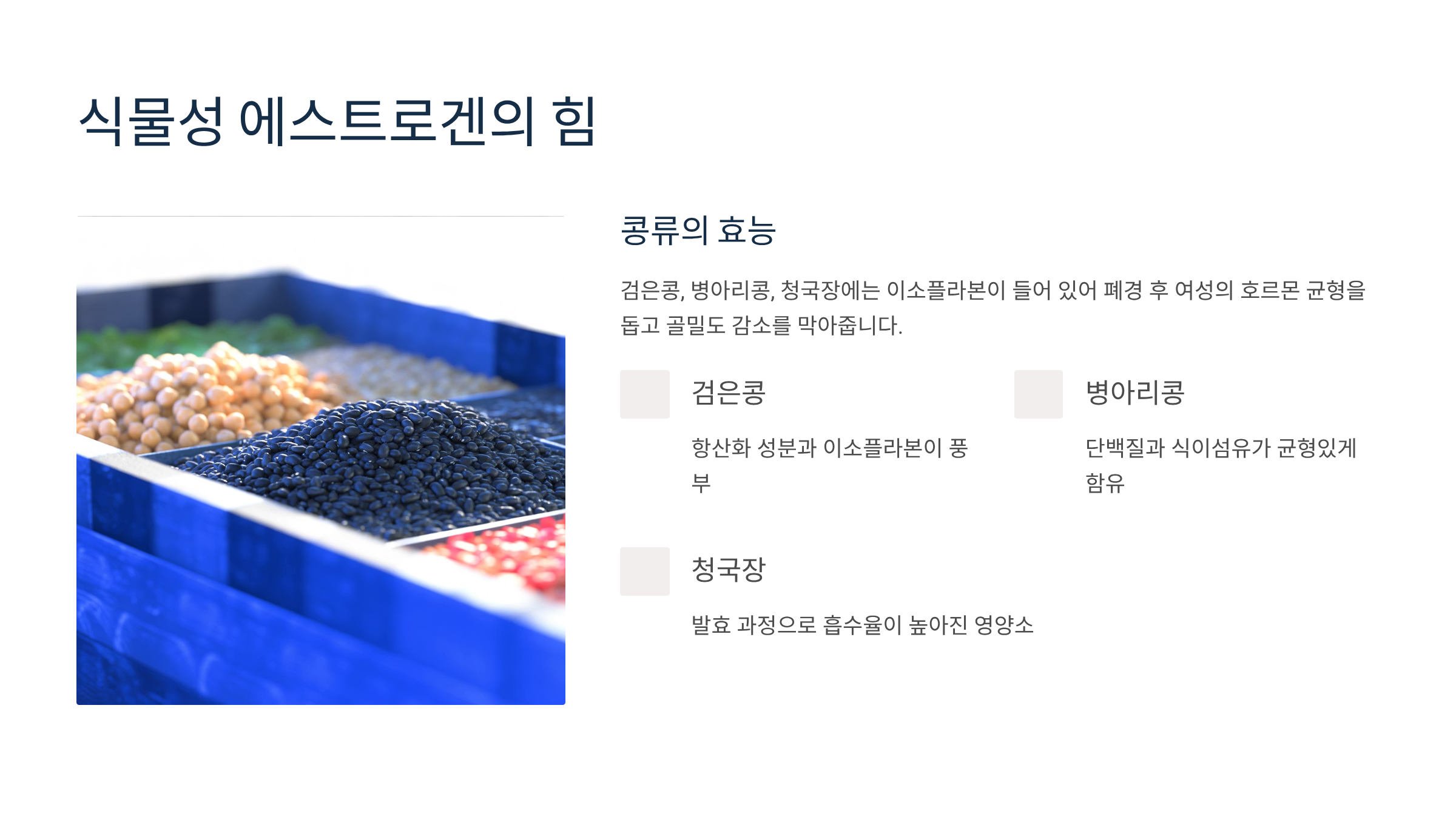 콩에는 식물성 에스트로겐인 이소플라본(isoflavone)이 들어 있어, 폐경 후 여성의 호르몬 균형을 돕고 골밀도 감소를 막아줍니다.