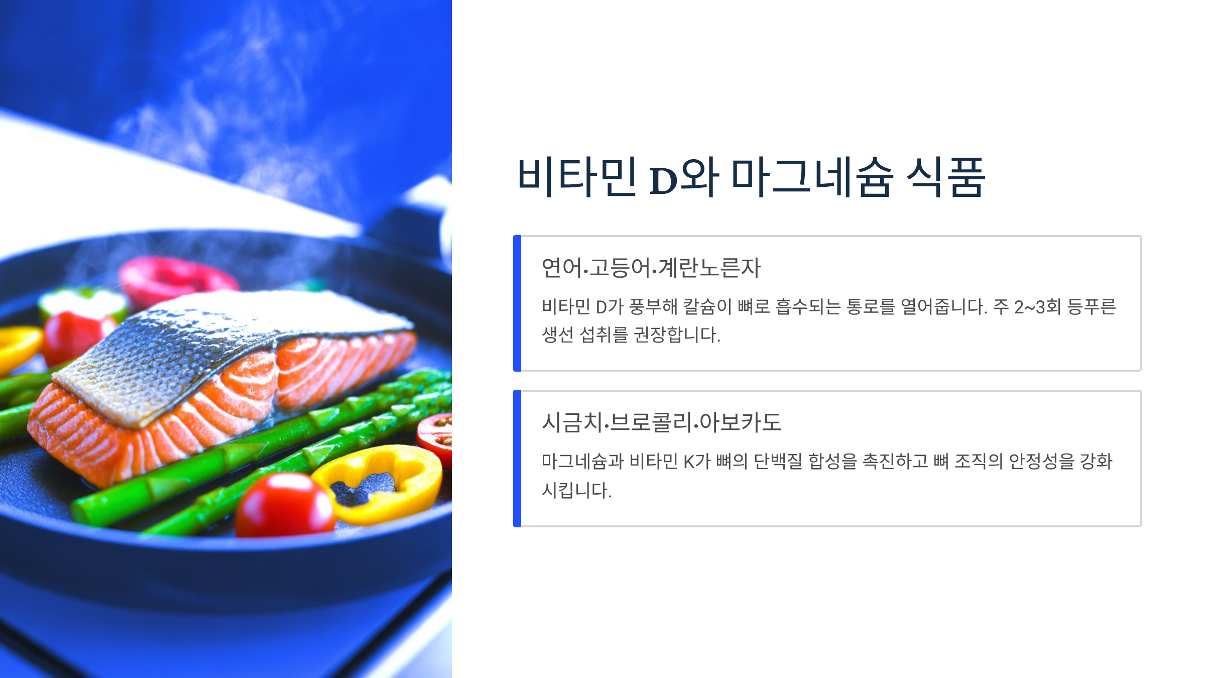 약물보다 중요한 건 꾸준한 영양 관리입니다. 칼슘과 비타민 D는 물론, 마그네슘, 단백질, 비타민 K가 함께 섭취되어야 뼈가 제대로 만들어집니다.
