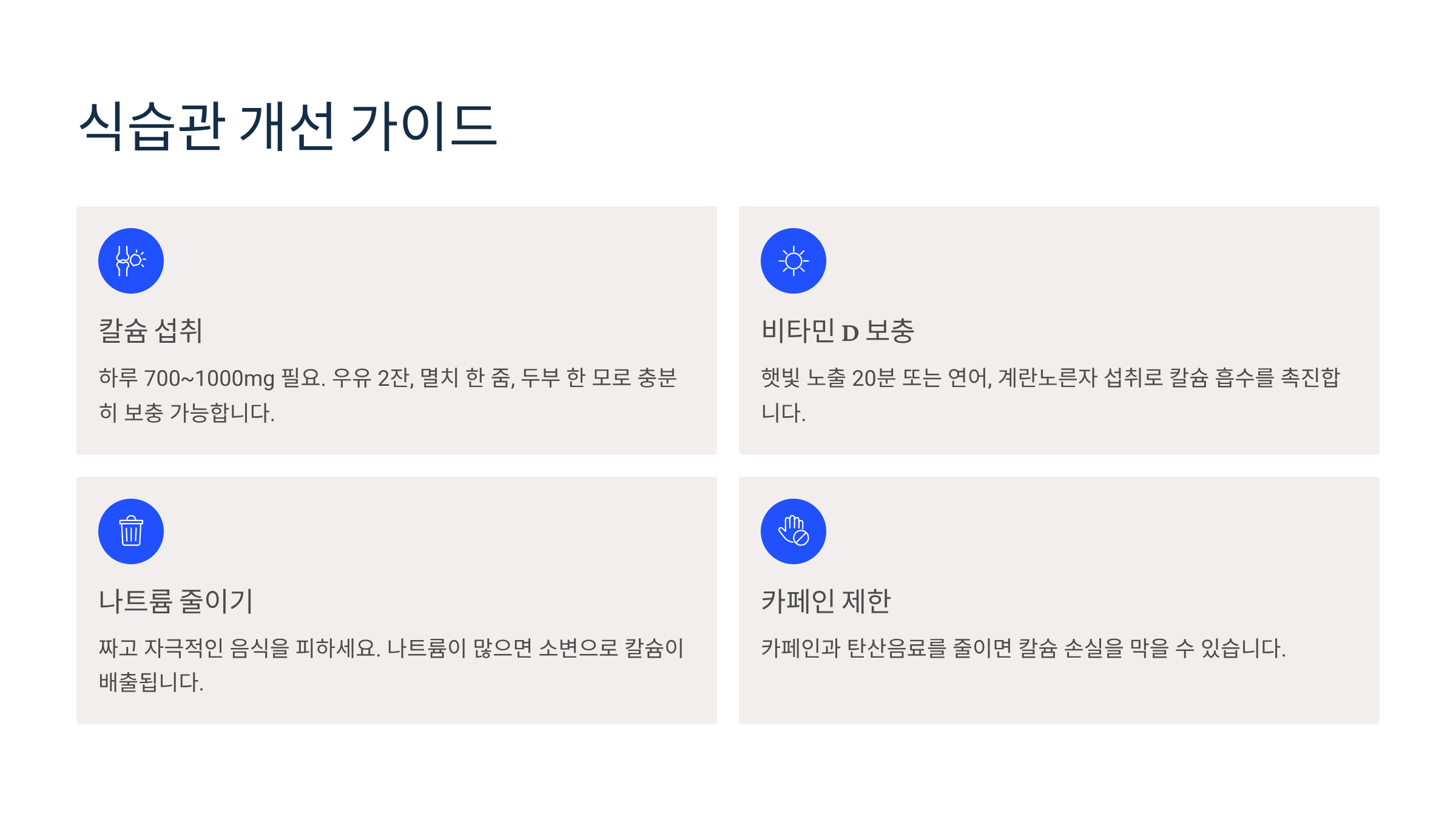 - 짜고 자극적인 음식 피하기: 나트륨이 많으면 소변으로 칼슘이 빠져나감