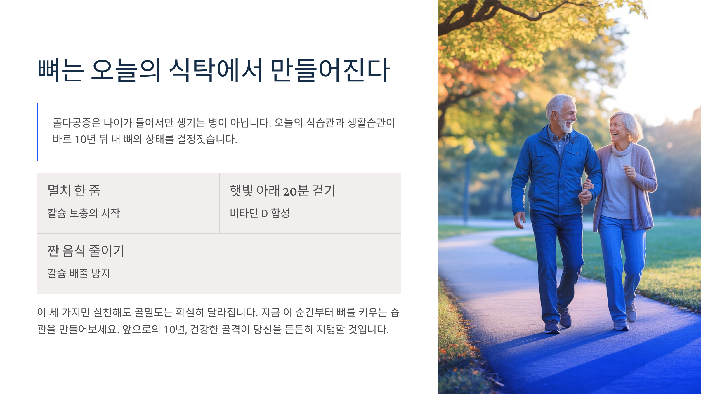 오늘의 식습관과 생활습관이 바로 10년 뒤 내 뼈의 상태를 결정짓습니다.