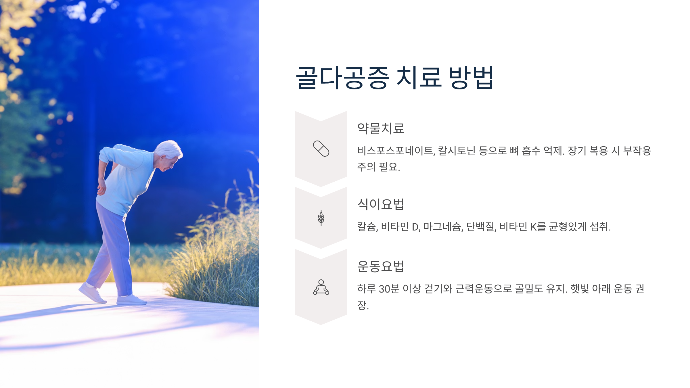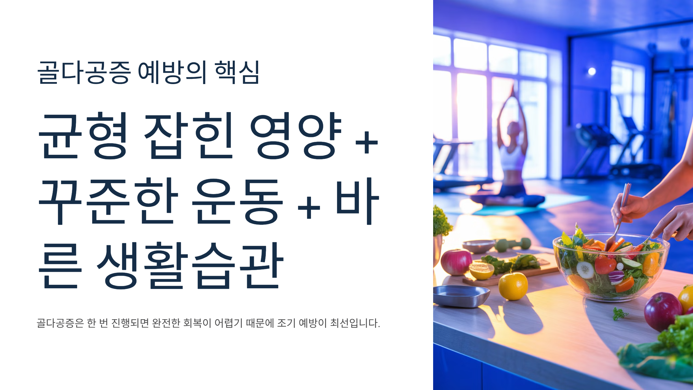 골다공증은 한 번 진행되면 완전한 회복이 어렵기 때문에, 조기 예방이 최선입니다.