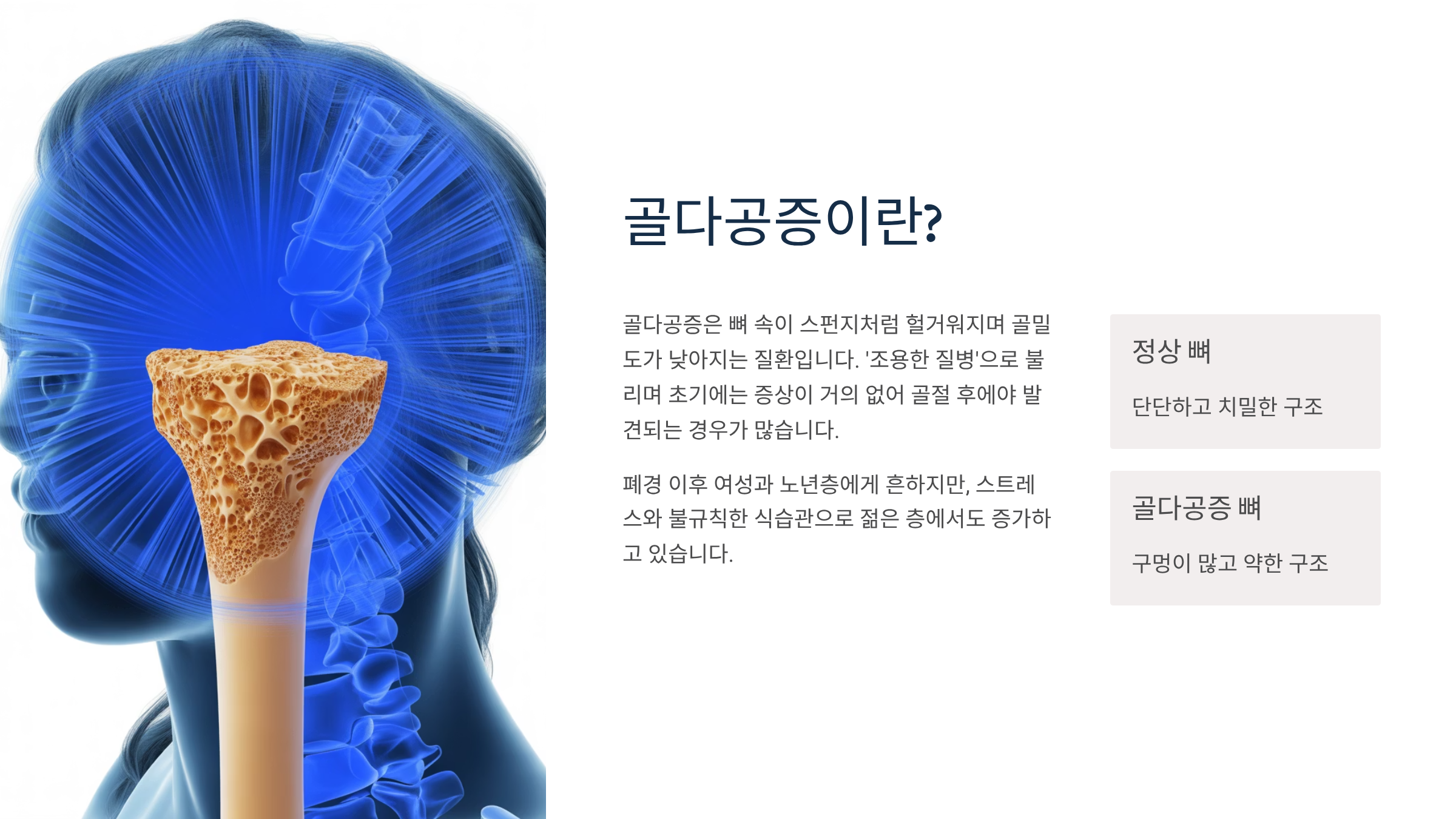 골다공증은 뼈 속이 비어 약해지는 질환으로, 나이와 상관없이 누구에게나 찾아올 수 있습니다.