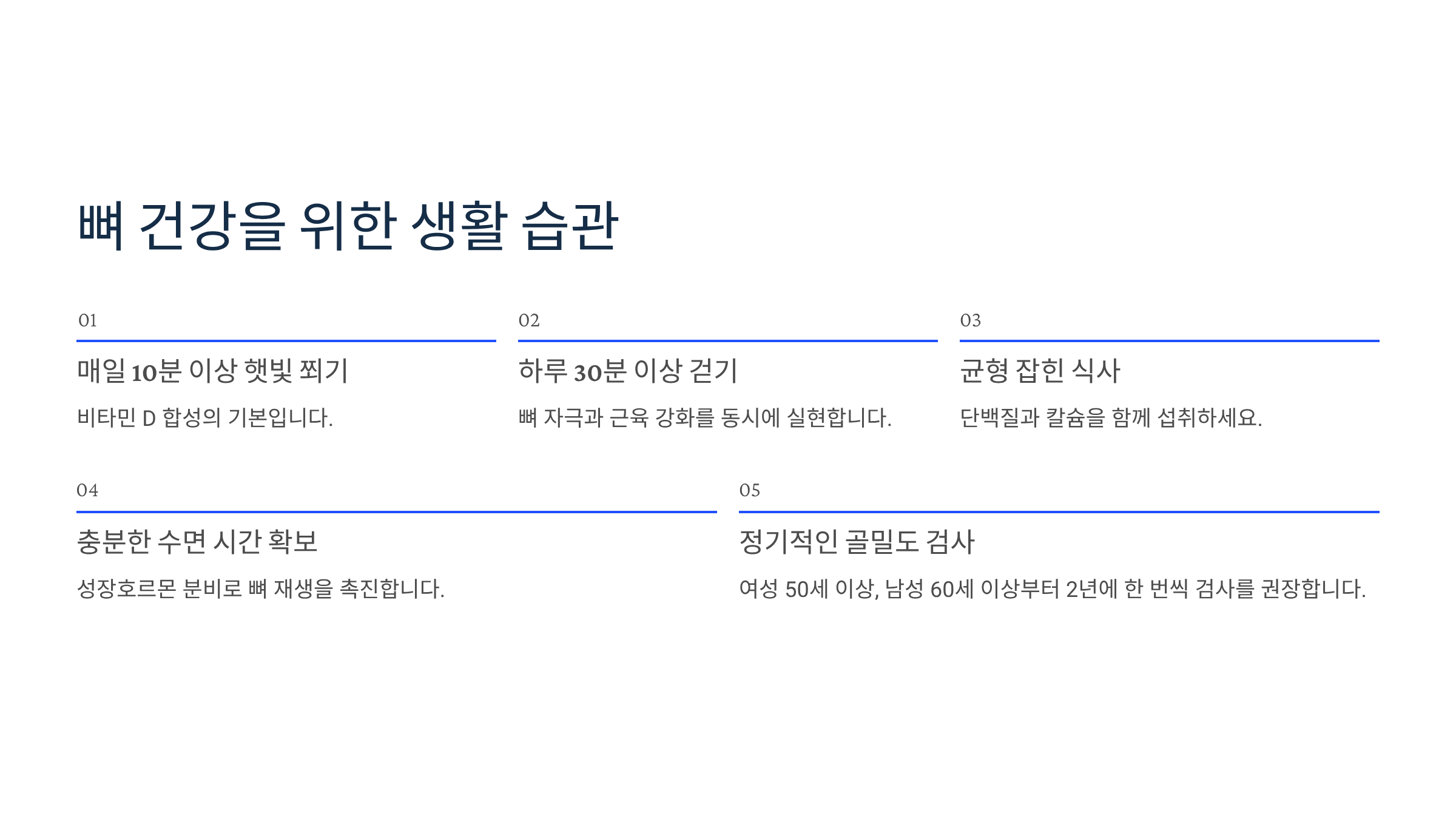 뼈는 압력을 받을 때 강해집니다. 걷기, 계단 오르기, 요가, 필라테스 등 가벼운 운동이라도 매일 지속하면 효과가 있습니다.
