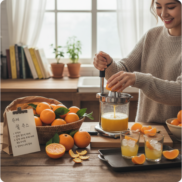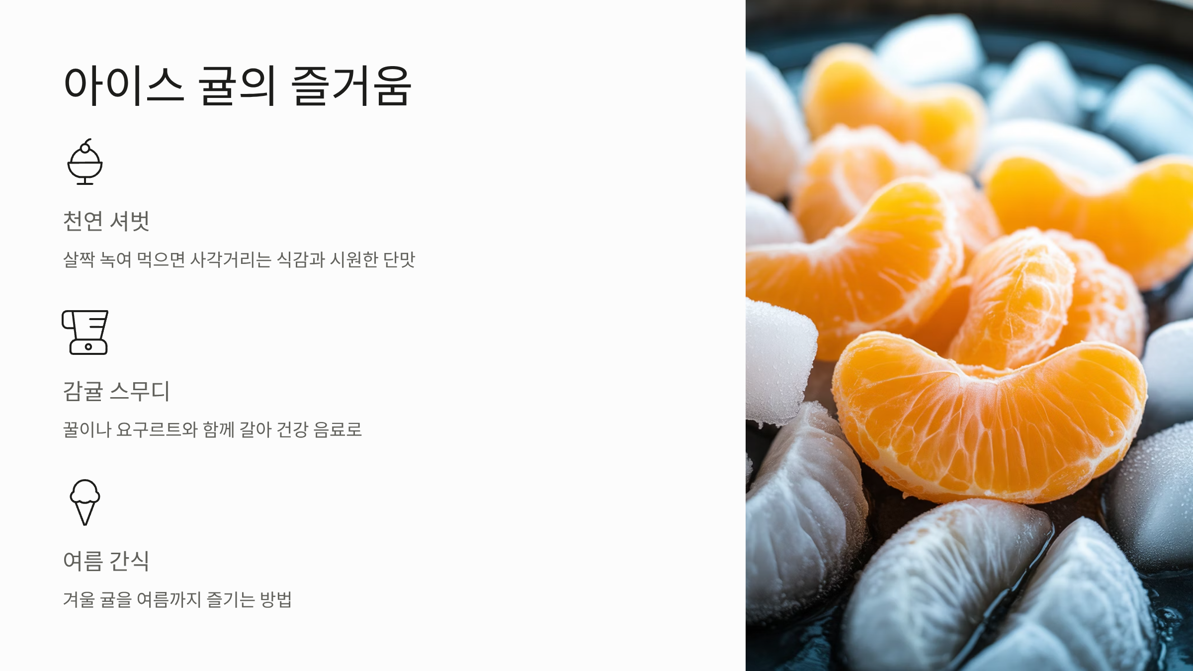 - 감귤 주스/스무디: 언 귤을 믹서기에 넣고 꿀이나 요구르트와 함께 갈아주면 첨가물 없는 건강한 감귤 스무디가 완성됩니다.