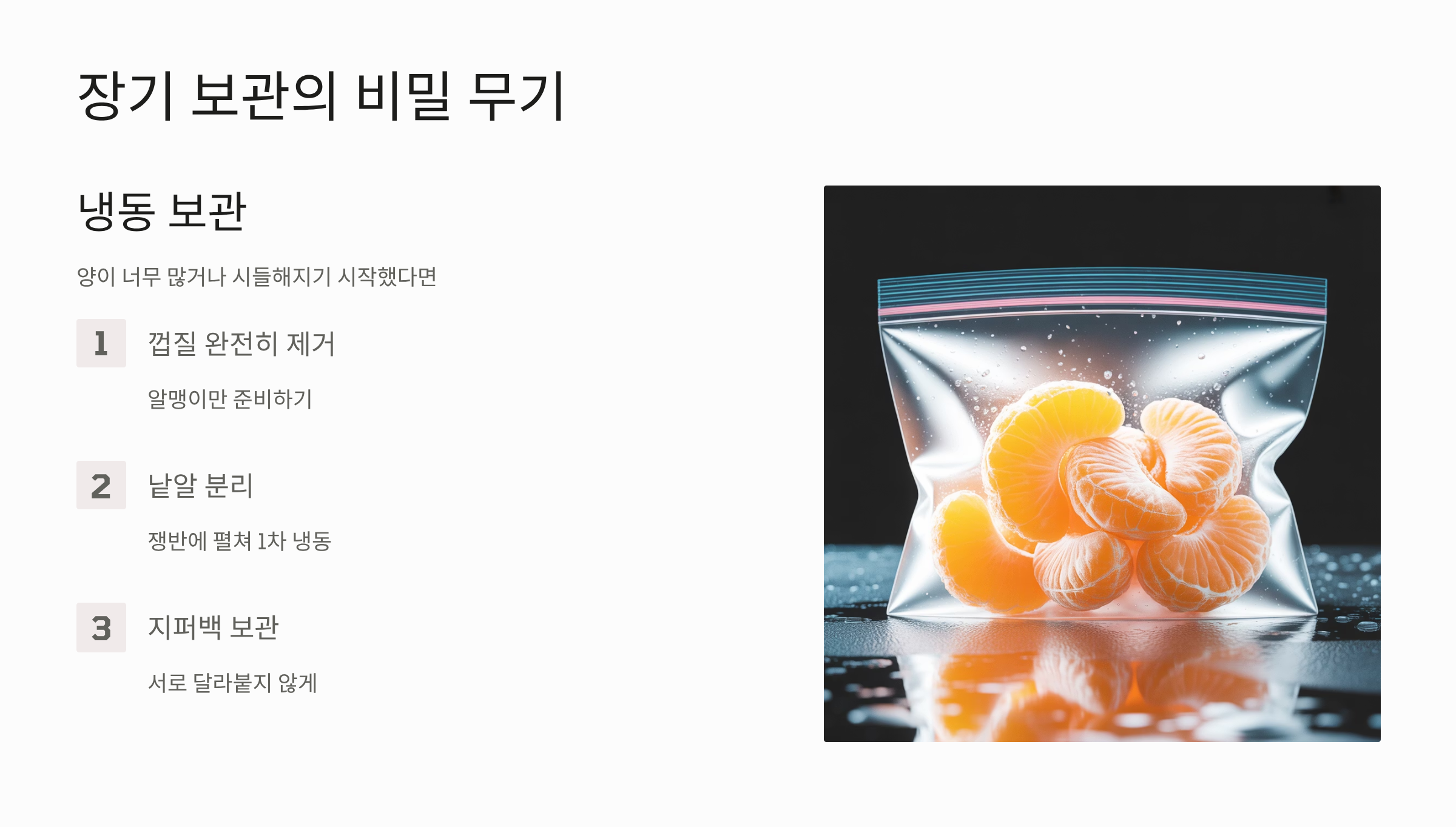 - 낱알 분리: 귤을 통째로 얼려도 좋지만, 한 조각씩 떼어내어 쟁반에 펼쳐 1차로 얼린 뒤, 지퍼백에 담아 보관하면 서로 달라붙지 않아 하나씩 꺼내 먹기 좋습니다.