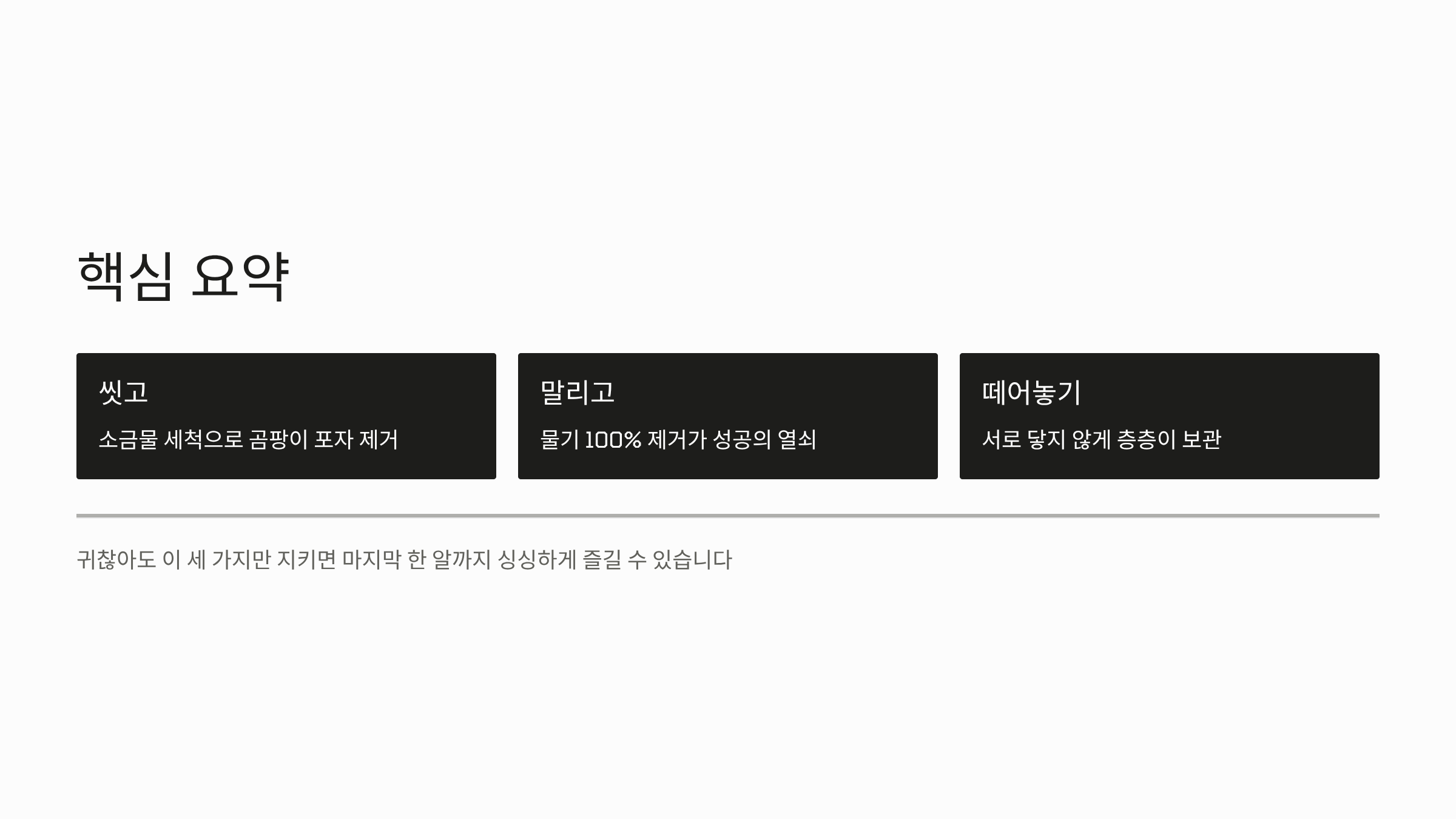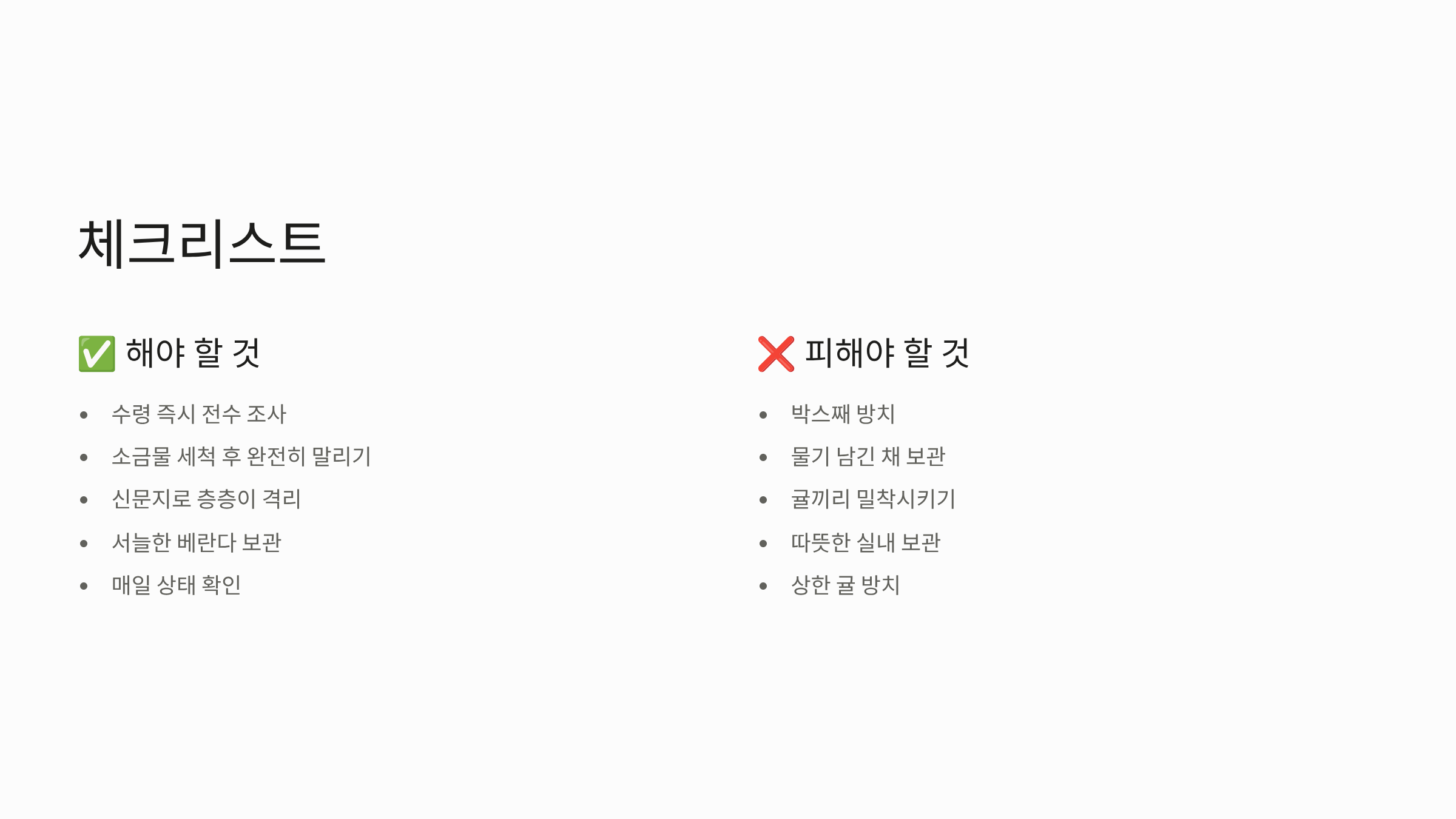 - 바닥 공사: 박스 바닥이나 보관 용기에 신문지 또는 도톰한 키친타월을 깔아 습기를 잡아줍니다.