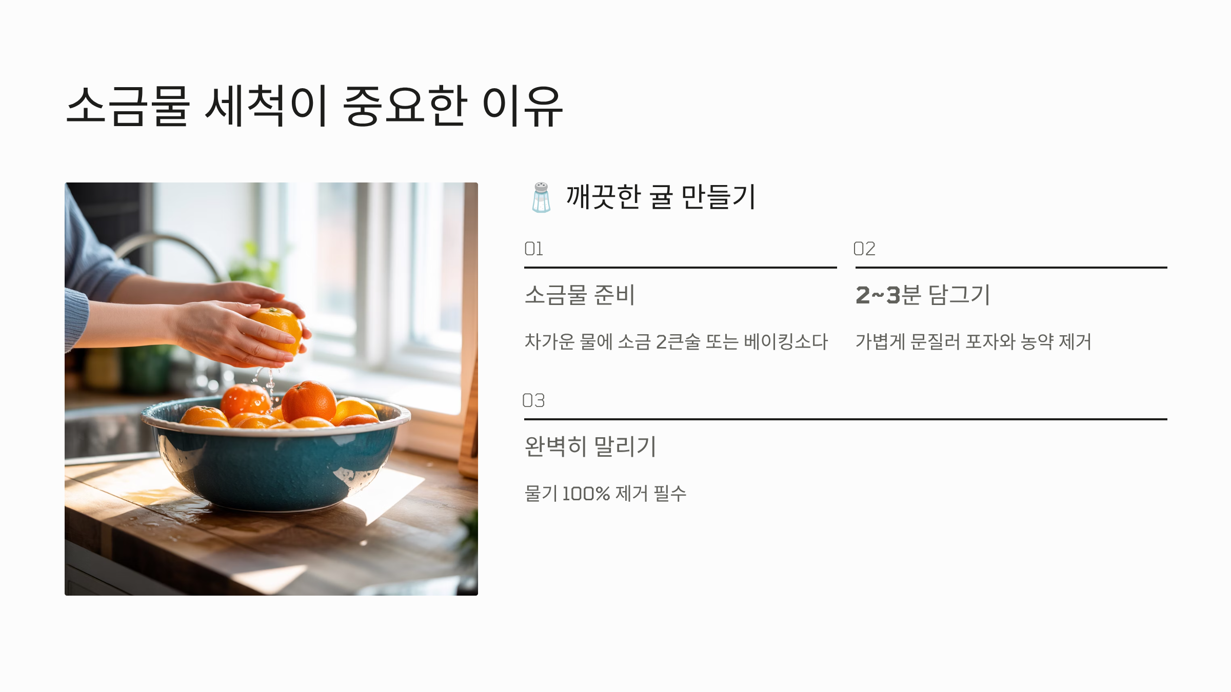 - 소금물 또는 베이킹소다 세척: 귤 껍질에는 눈에 보이지 않는 곰팡이 포자나 농약 잔여물이 남아있을 수 있습니다.