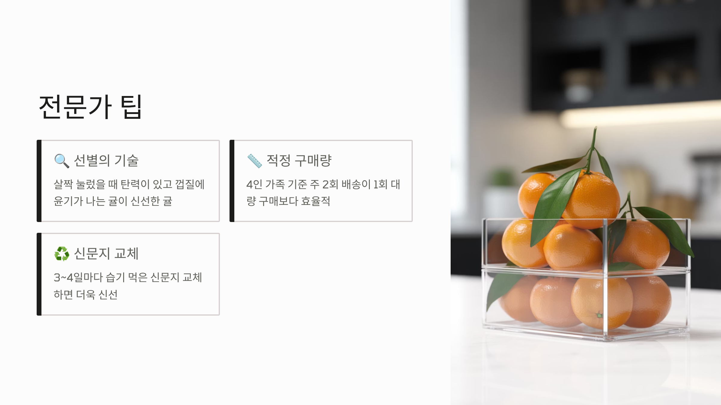 귤 보관방법의 핵심은 '귀찮아도 씻고, 말리고, 떼어놓기'입니다. 박스를 받자마자 상한 귤을 골라내고 소금물로 세척하여 곰팡이 원인균을 제거하세요. 신문지를 활용해 서로 닿지 않게 층층이 쌓아 서늘한 베란다에 두면 마지막 하나까지 싱싱하고 달콤한 귤을 즐길 수 있습니다. 만약 귤이 너무 많다면 껍질을 까서 냉동 보관해 보세요. 겨울철 색다른 디저트로 입맛을 돋워줄 것입니다.