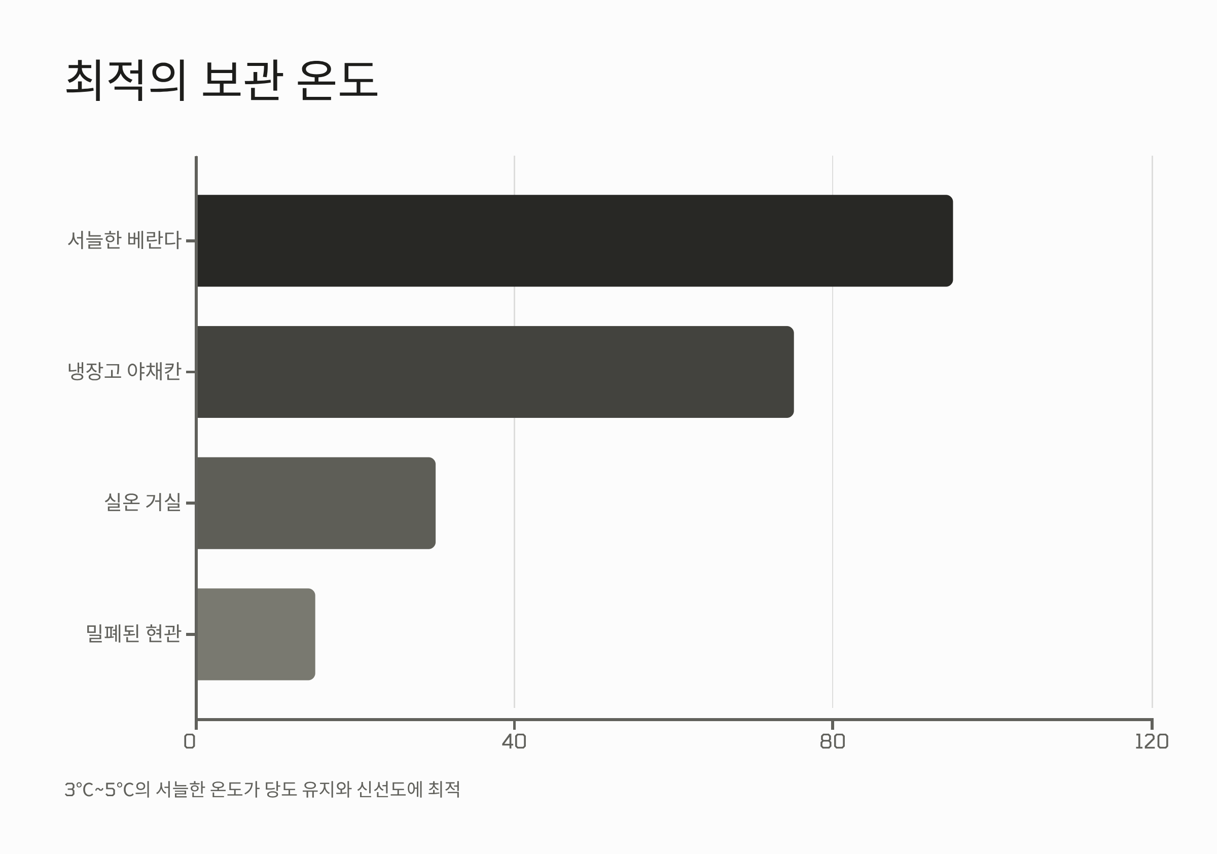 - 최적 온도 (3℃~5℃): 귤은 서늘하고 통풍이 잘 되는 실온(베란다, 다용도실)에 보관하는 것이 가장 좋습니다. 적당한 추위는 귤의 당도를 유지하고 숙성을 늦춥니다.