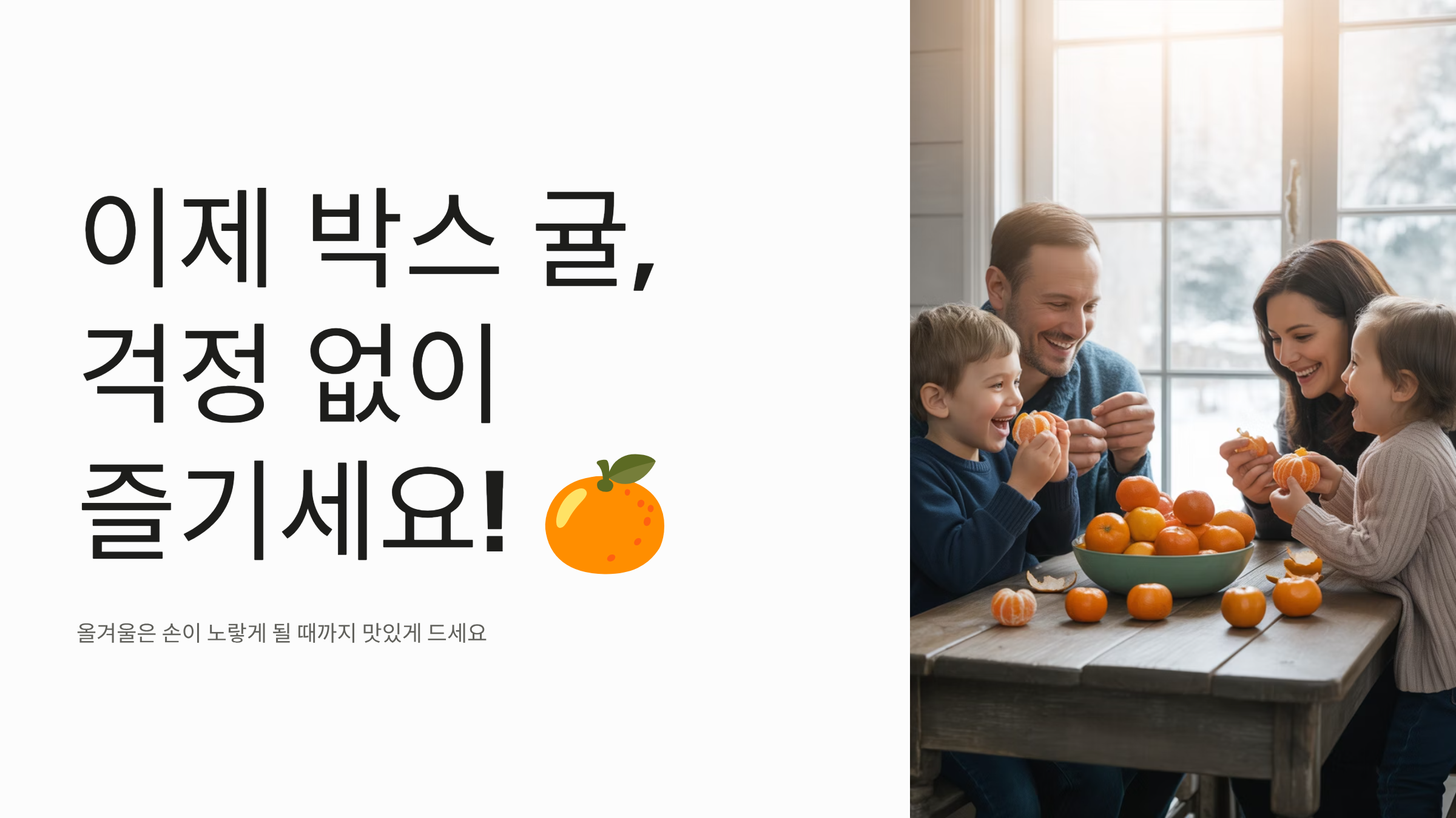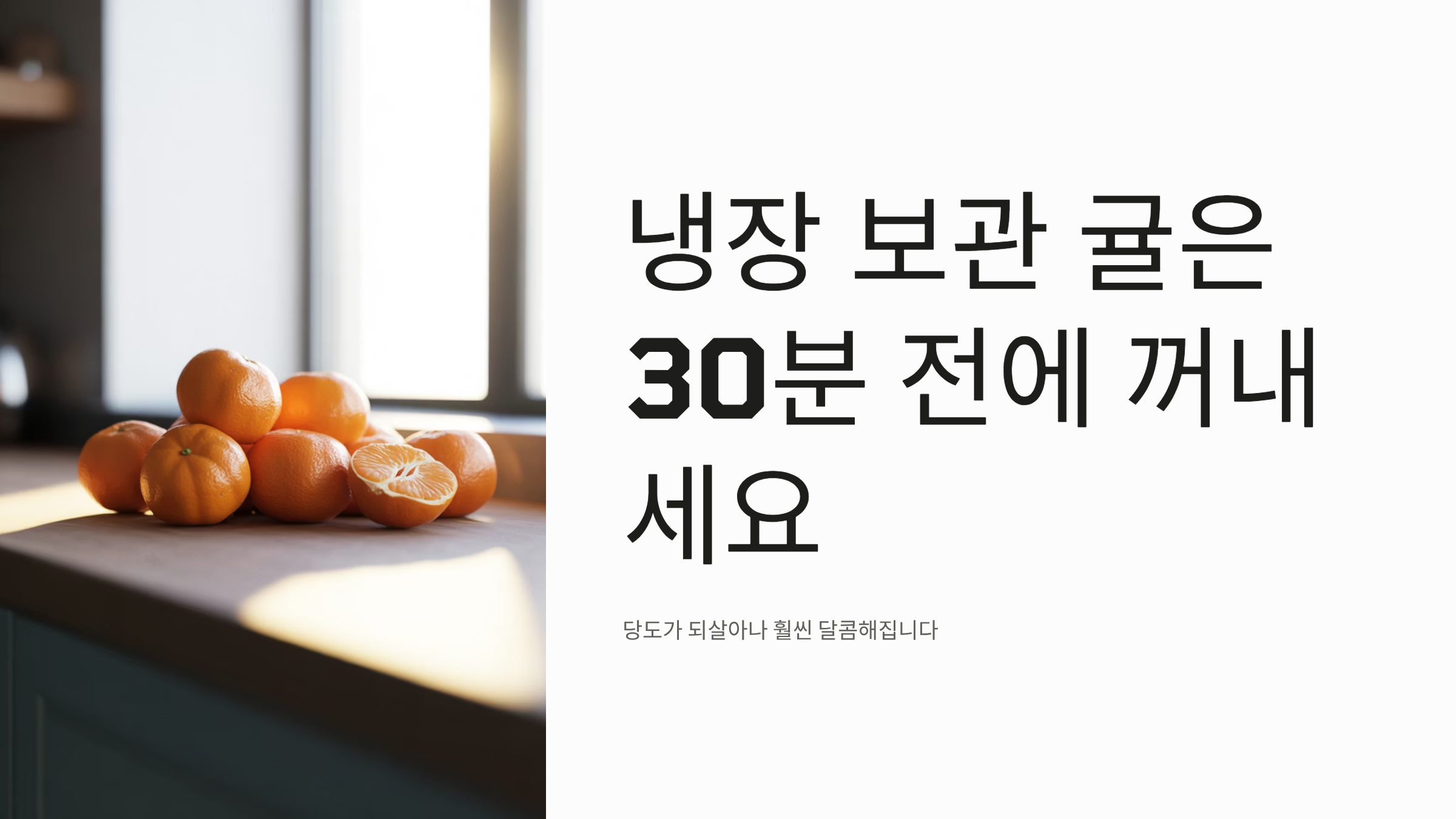 - 주의: 냉장 보관한 귤은 신맛이 강해질 수 있습니다. 드시기 30분 전에 미리 꺼내두면 당도가 다시 살아나 더 맛있게 즐길 수 있습니다.