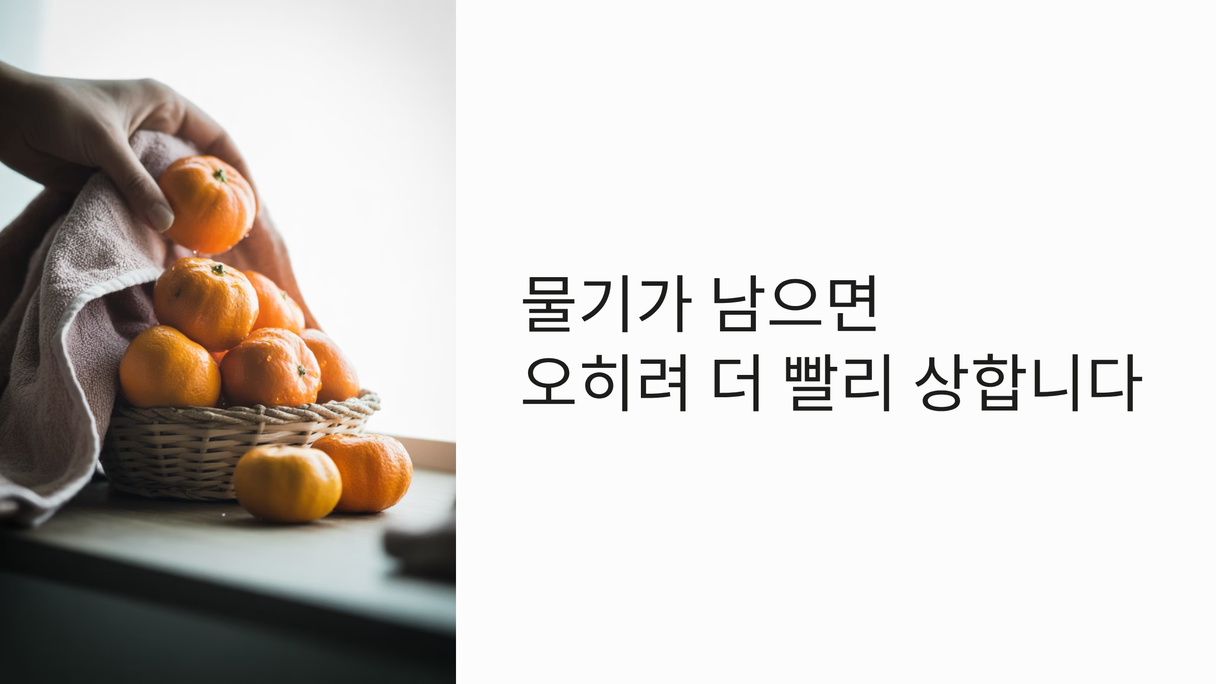 - 깨끗한 물로 헹군 후, 물기를 100% 완벽하게 제거해야 합니다. 마른 수건으로 닦고 통풍이 잘 되는 곳에서 잠시 말려주세요. 물기가 남아있으면 오히려 더 빨리 상합니다.