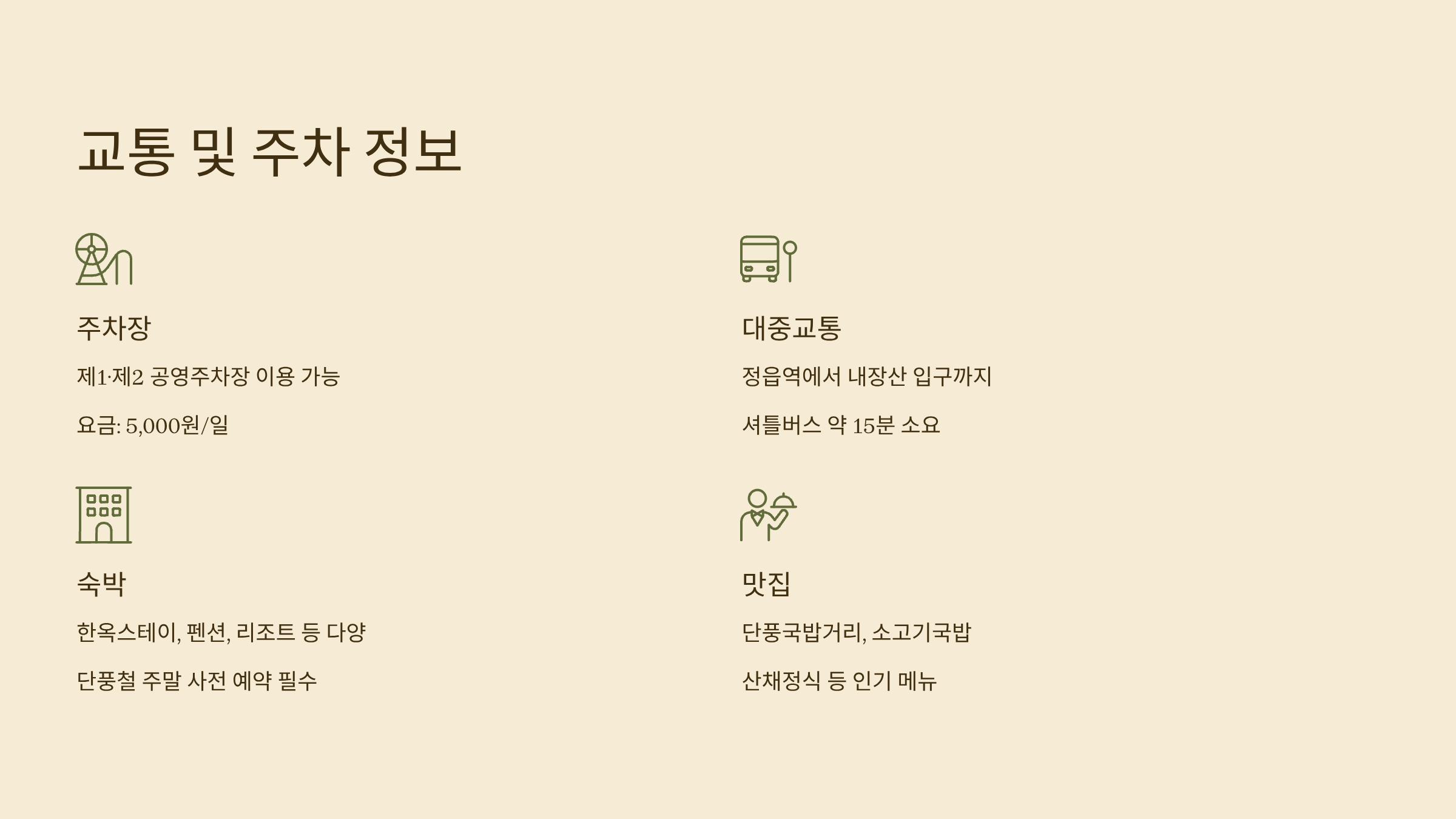 - 내장산 주차장: 제1·제2 공영주차장 모두 이용 가능 (요금 5,000원/일)