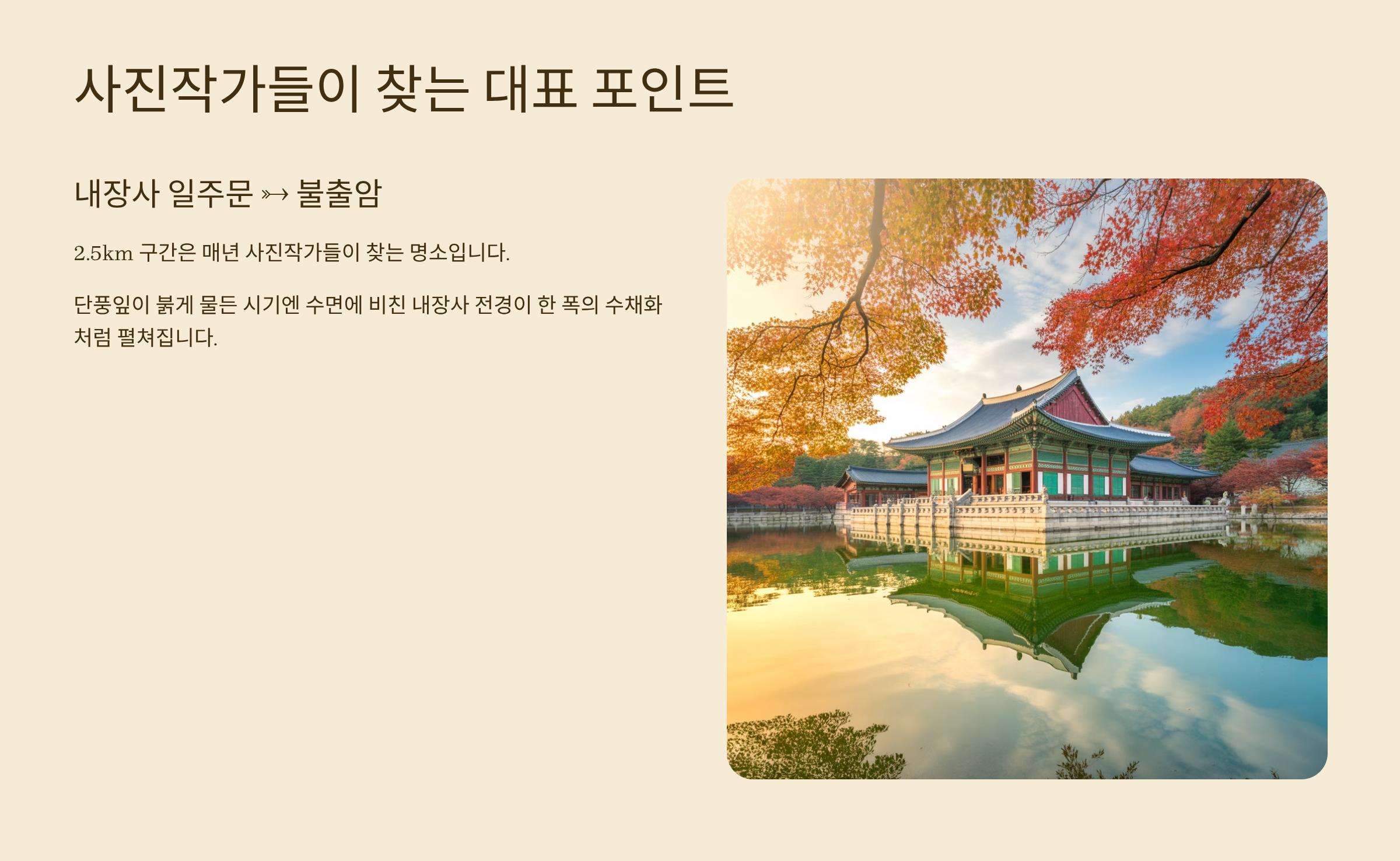 특히 내장사 일주문에서 불출암까지 이어지는 2.5km 구간은 사진작가들이 매년 찾는 대표 포인트입니다.