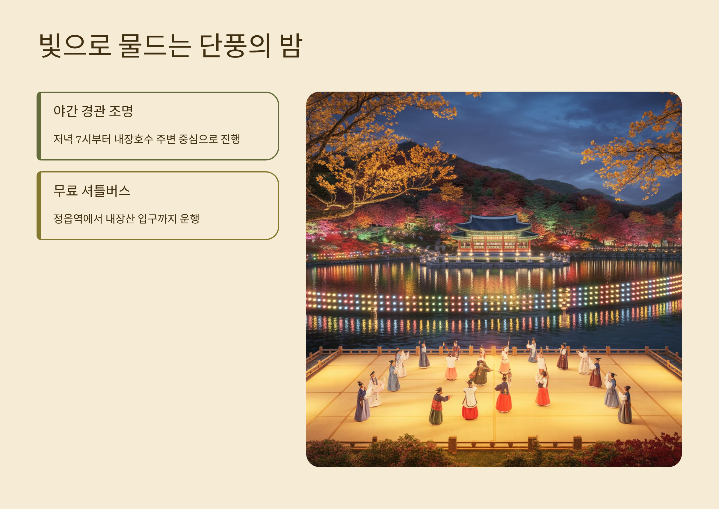 정읍시청과 지역 상인회가 협력해 만든 “빛으로 물드는 단풍의 밤” 프로그램은 저녁 7시부터 내장호수 주변을 중심으로 진행됩니다.