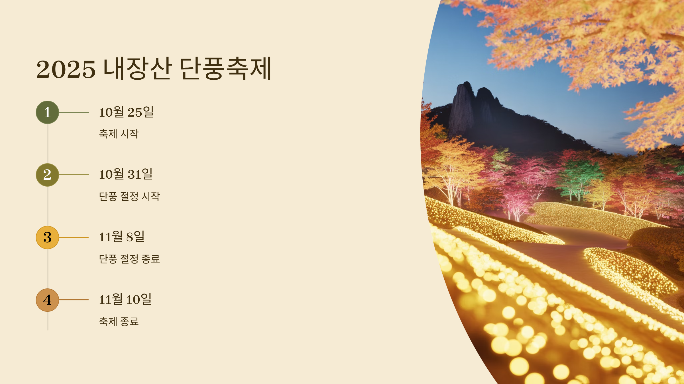 2025년 내장산 단풍축제는 10월 25일부터 11월 10일까지 열리며, 올해는 전통 공연과 야간 경관 조명이 대폭 확대되었습니다.