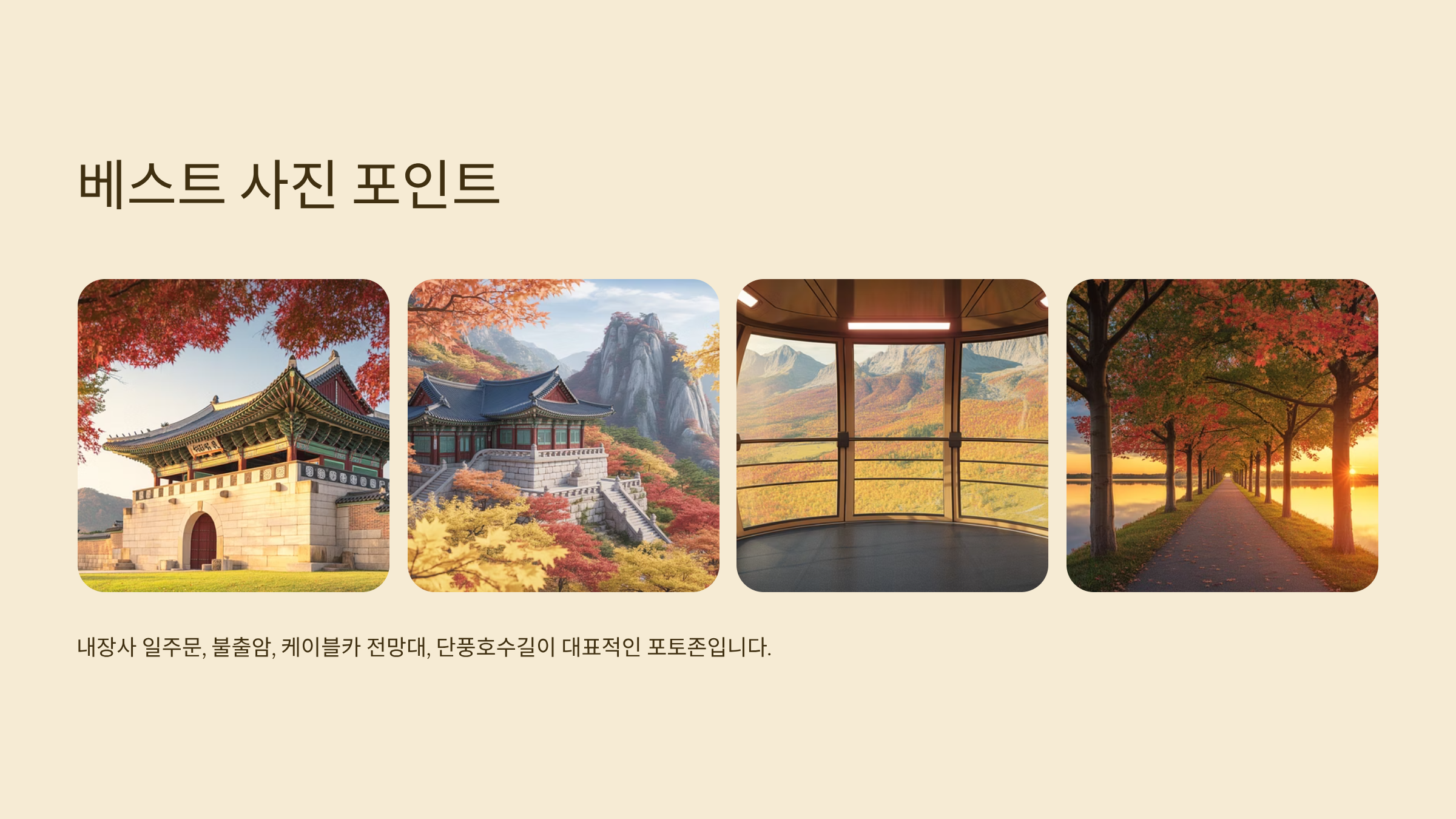 - 사진 포인트: 내장사 일주문, 불출암, 케이블카 전망대, 단풍호수길