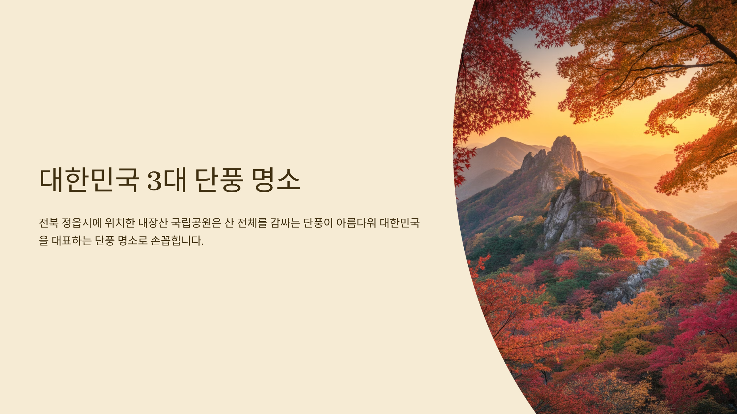 내장산 국립공원은 전북 정읍시에 위치해 있으며, 단풍이 산 전체를 감싸는 모습이 아름다워 ‘대한민국 3대 단풍 명소’로 꼽힙니다.
