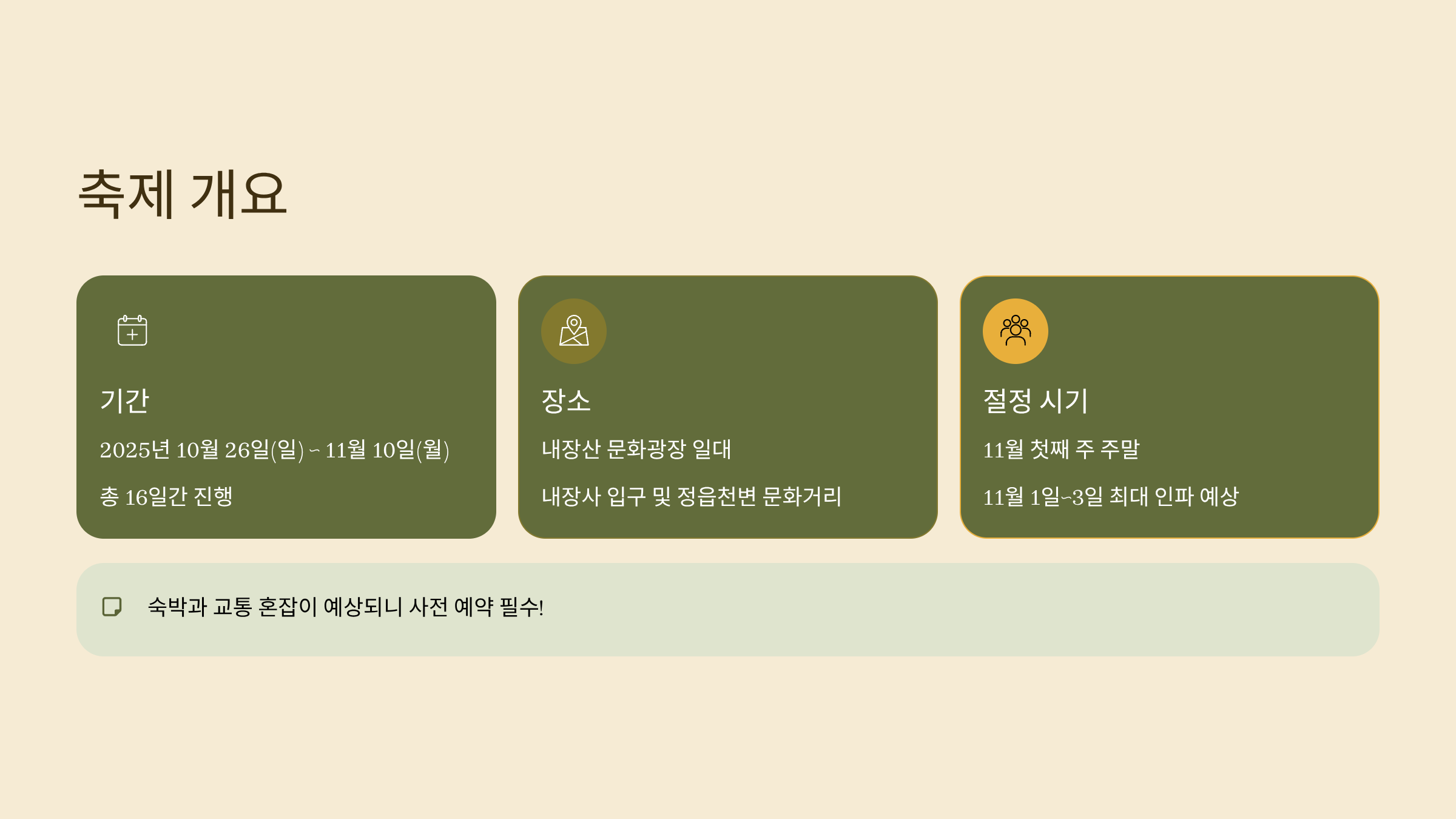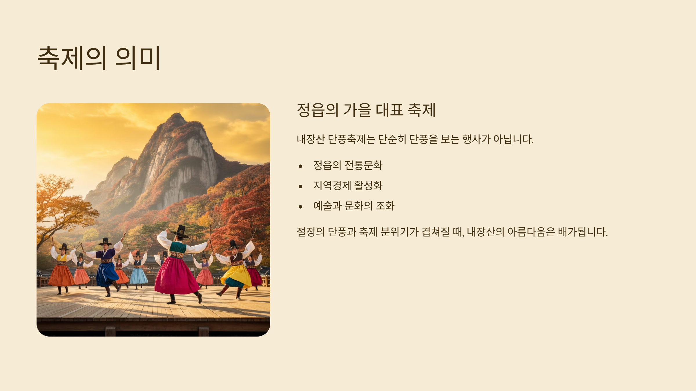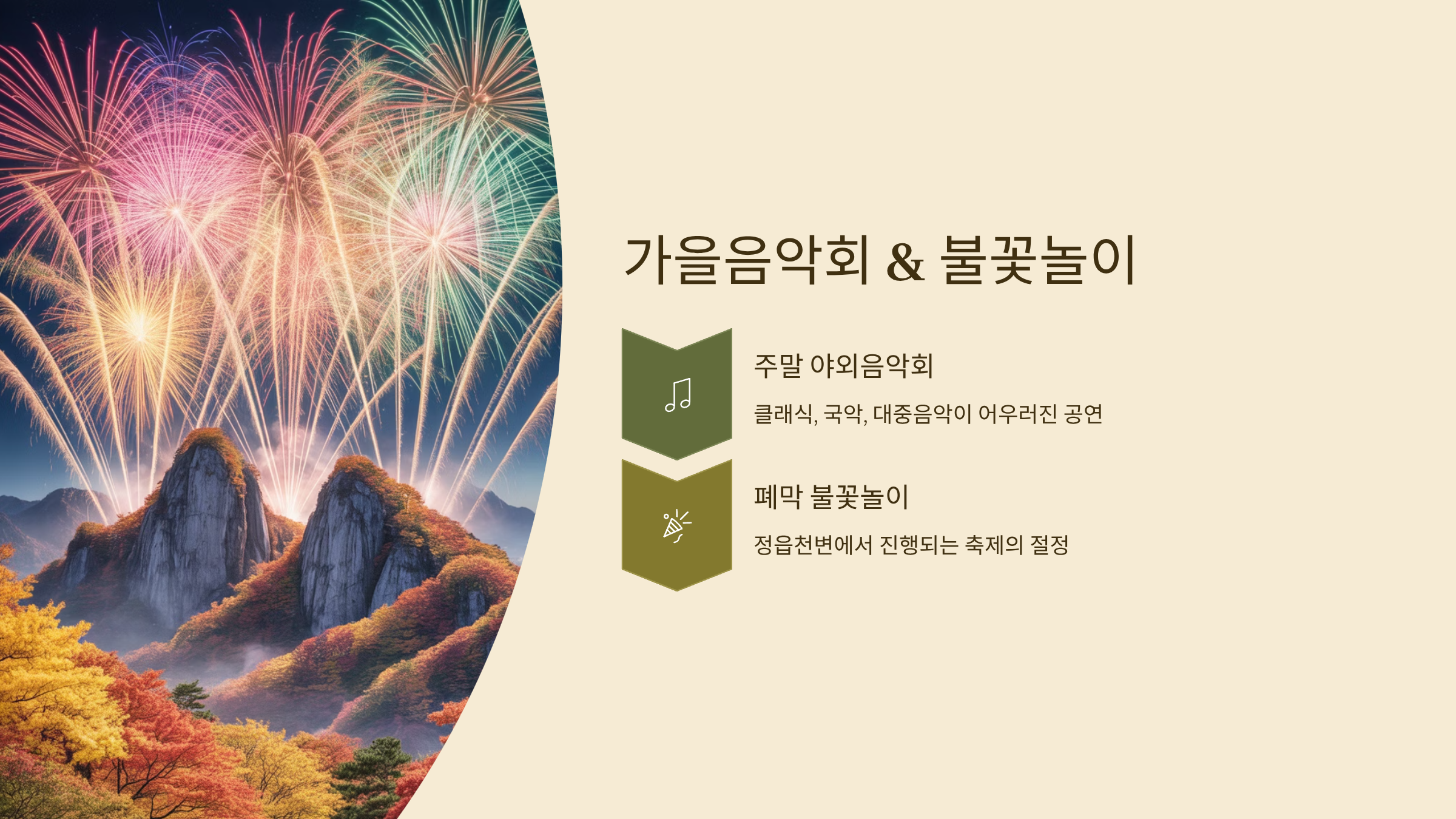정읍시는 매년 내장산 단풍이 가장 아름다울 때를 골라 축제를 개최하며, 단풍 감상뿐 아니라 지역의 전통문화와 먹거리를 함께 즐길 수 있어 전국적인 인기를 얻고 있죠.