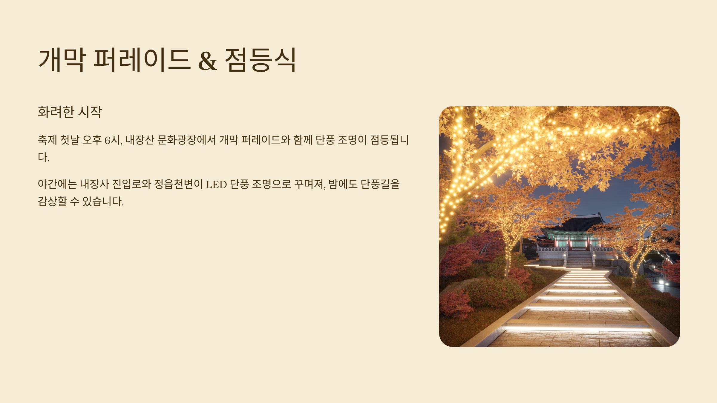 - 축제 첫날 오후 6시, 내장산 문화광장에서 화려한 개막 퍼레이드와 함께 단풍 조명이 점등됩니다.