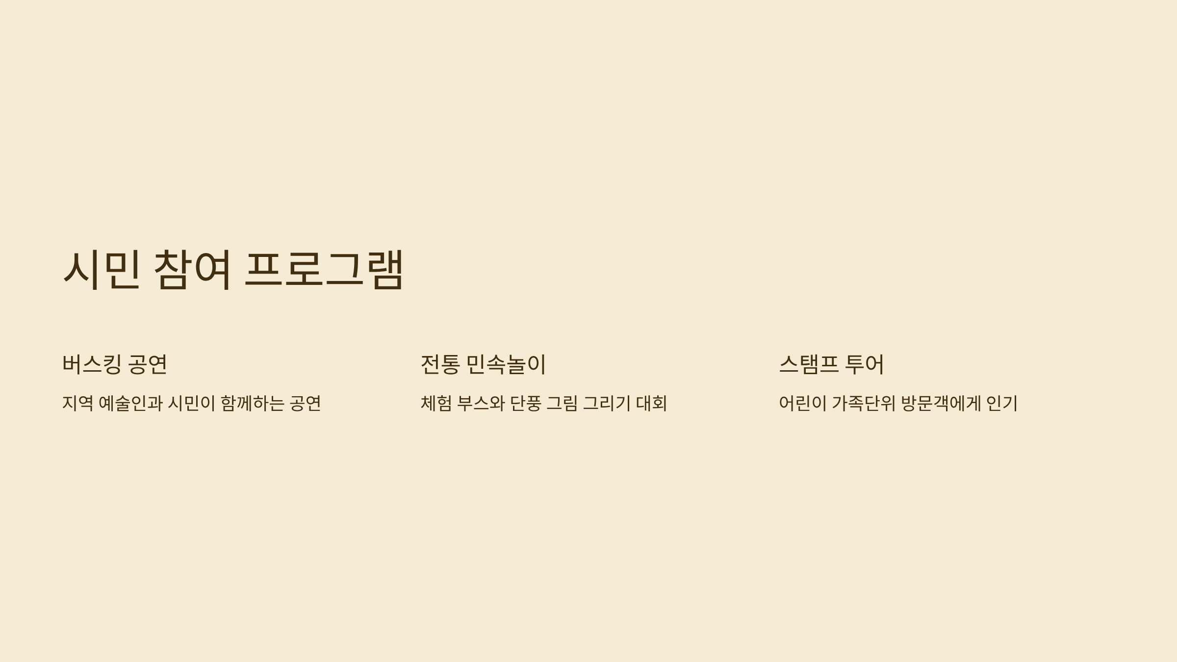 - 지역 예술인과 시민이 함께하는 버스킹 공연, 전통 민속놀이 체험, 단풍 그림 그리기 대회 등이 열립니다.